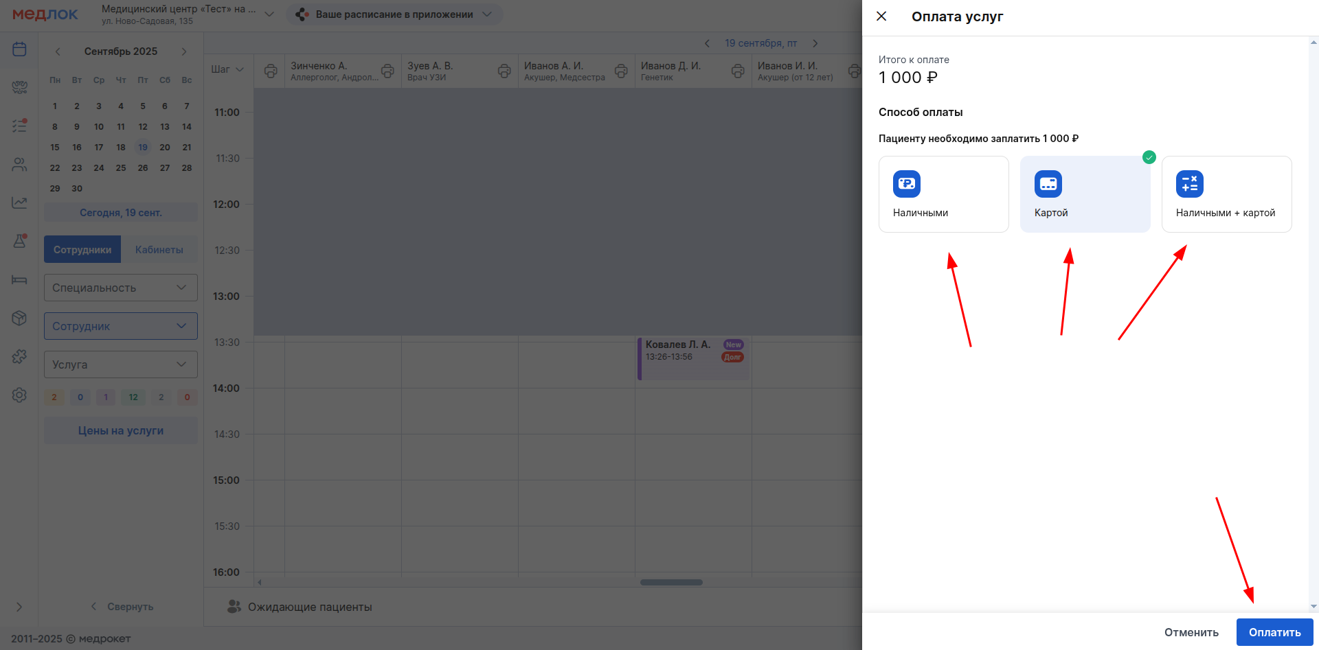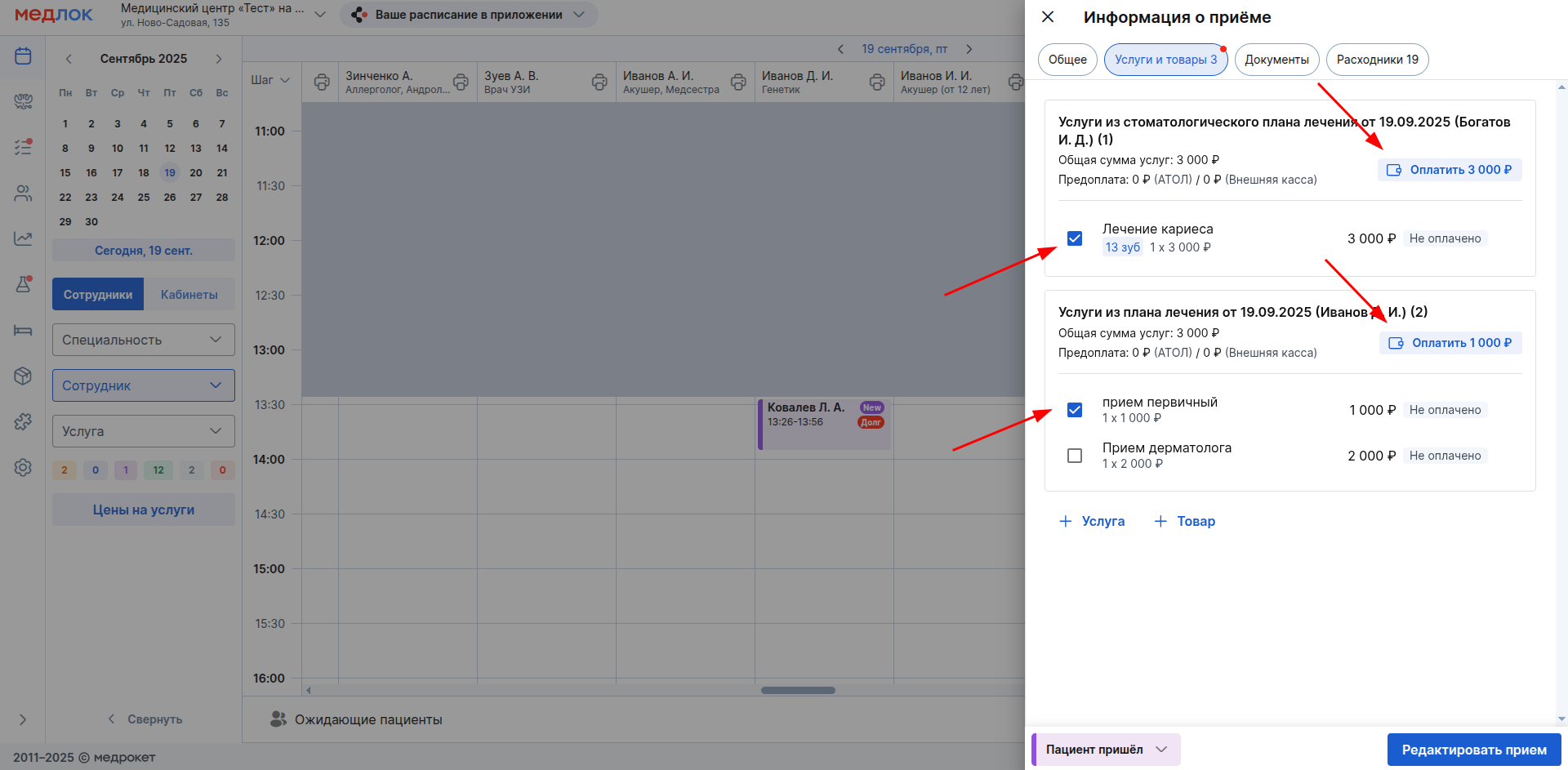 Важно! Оплата услуг возможна только после проставления статусов «Пациент пришёл», «Начат визит» или «Выполнен».