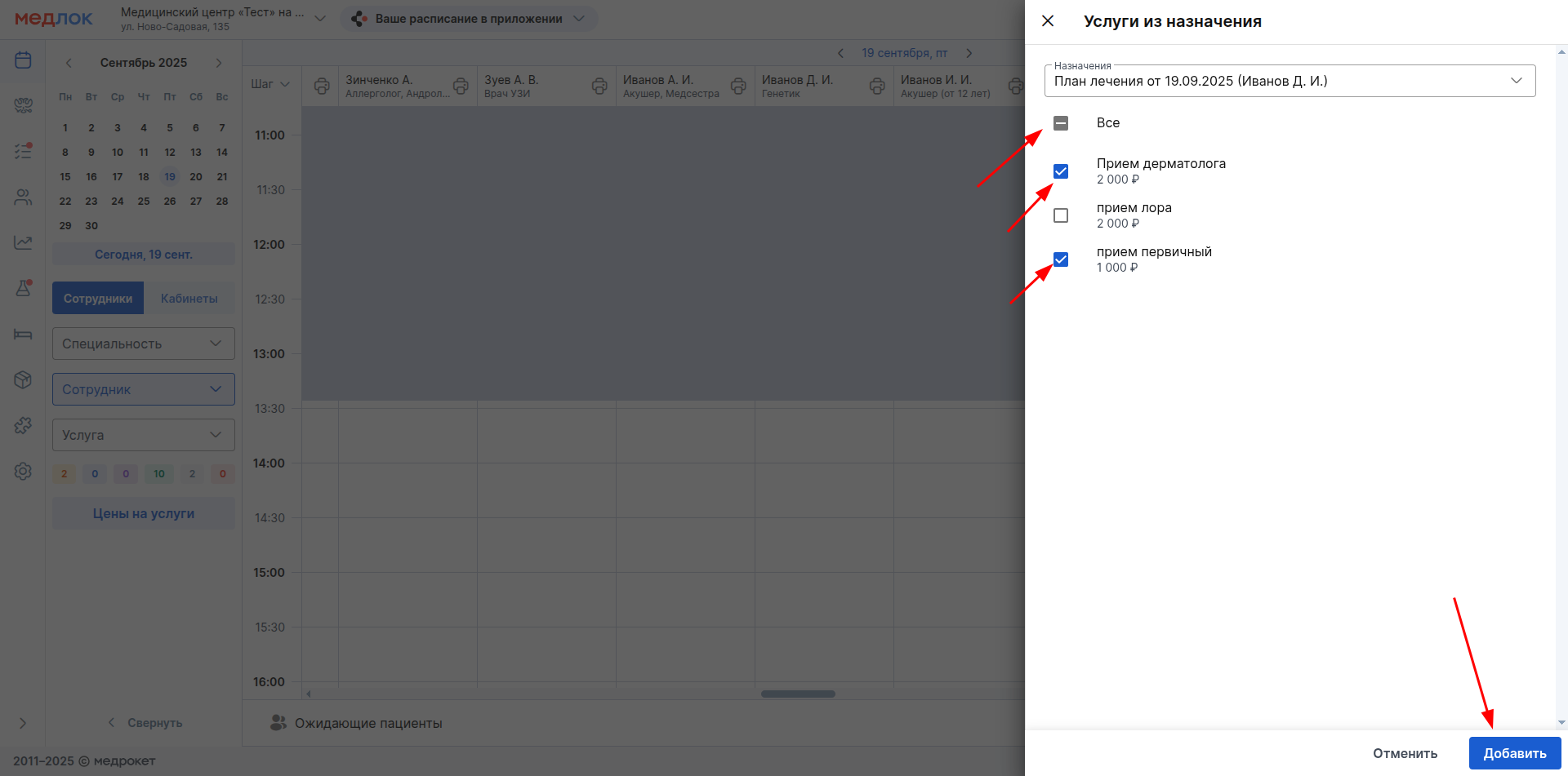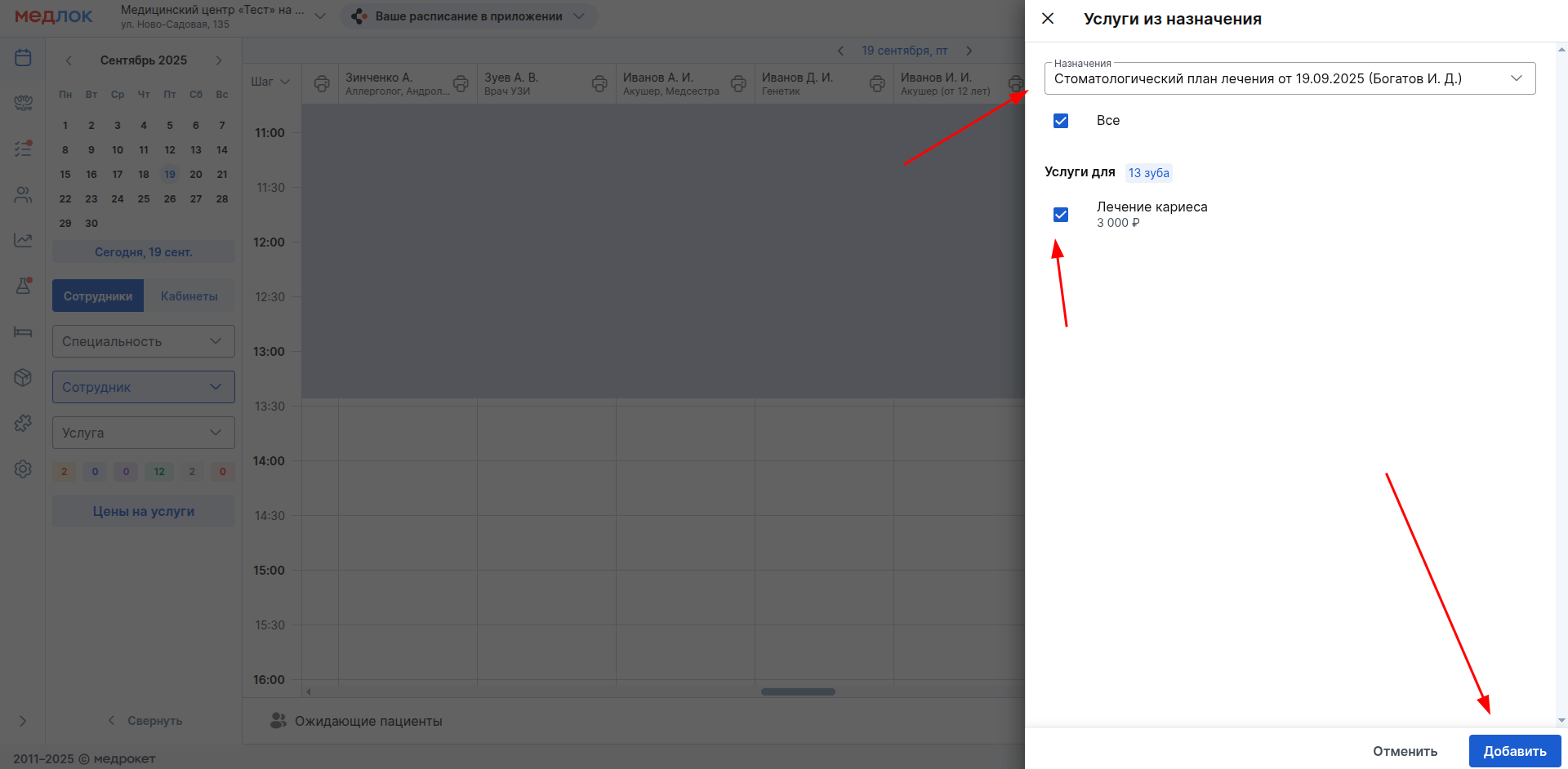 4. После выбора нужного плана лечения, отметьте галочками услуги, которые нужно назначить пациенту. Или поставьте галочку в строке «Все», чтобы отметить для добавления все услуги. После этого нажмите «Добавить» внизу окна.