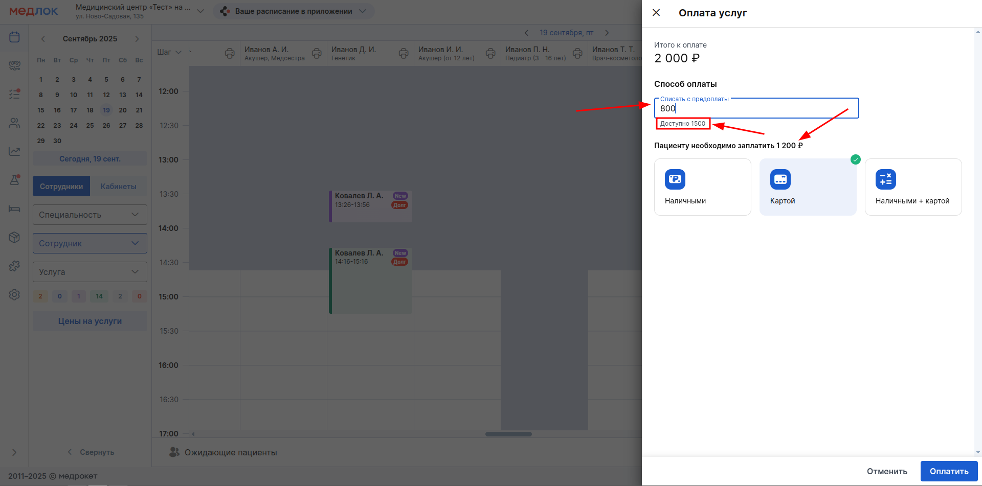 6. В окне оплаты будет возможность использовать все средства из предоплаты или внести нужную сумму в окно «Списать с предоплаты». После этого, автоматически рассчитается часть, которую нужно оплатить пациенту.