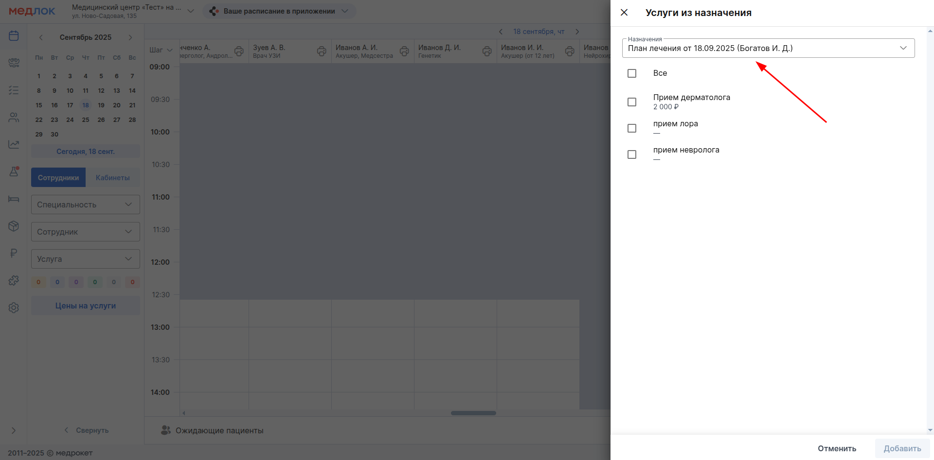 Добавление в запись на приём услуг из плана лечения