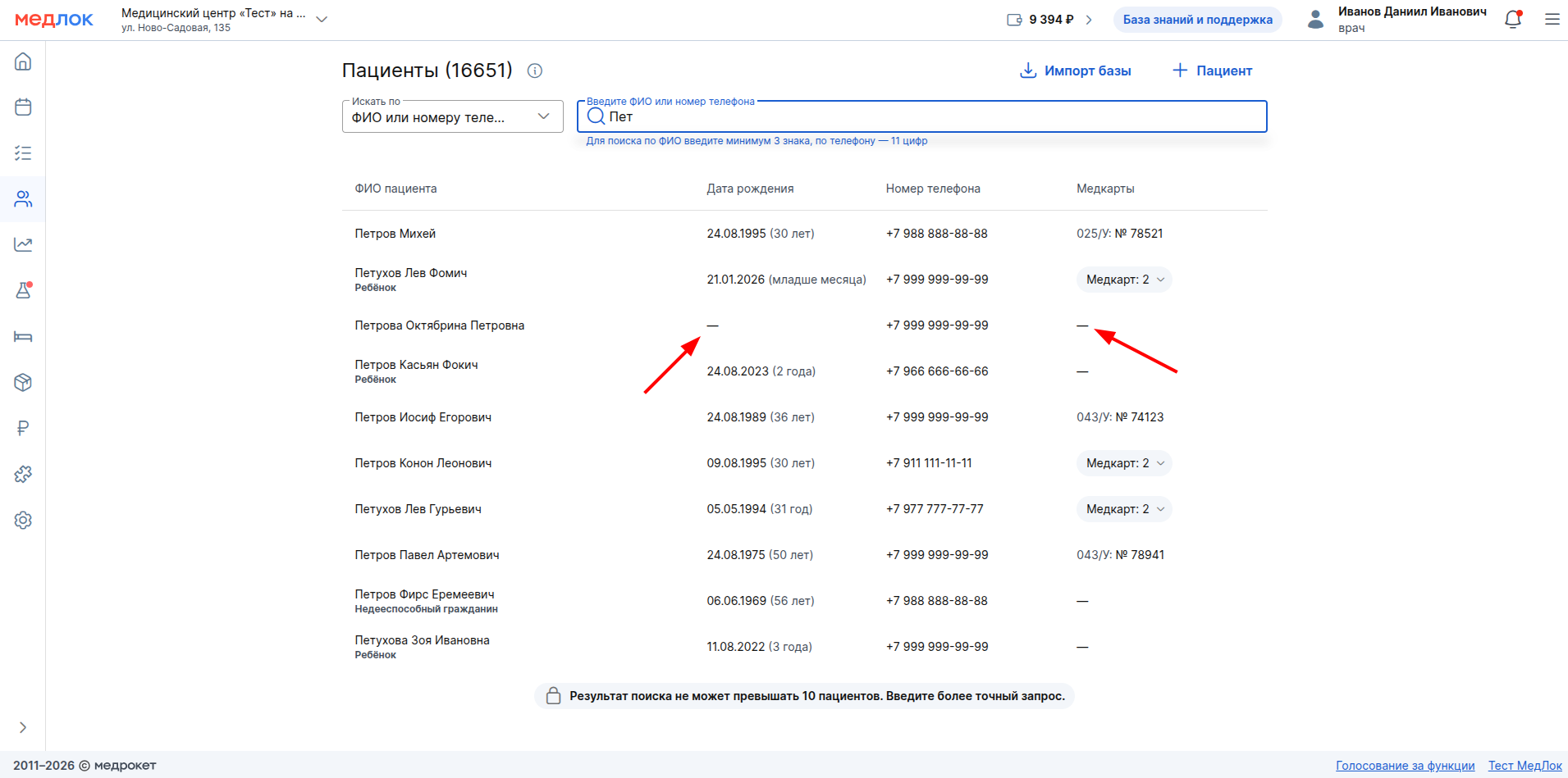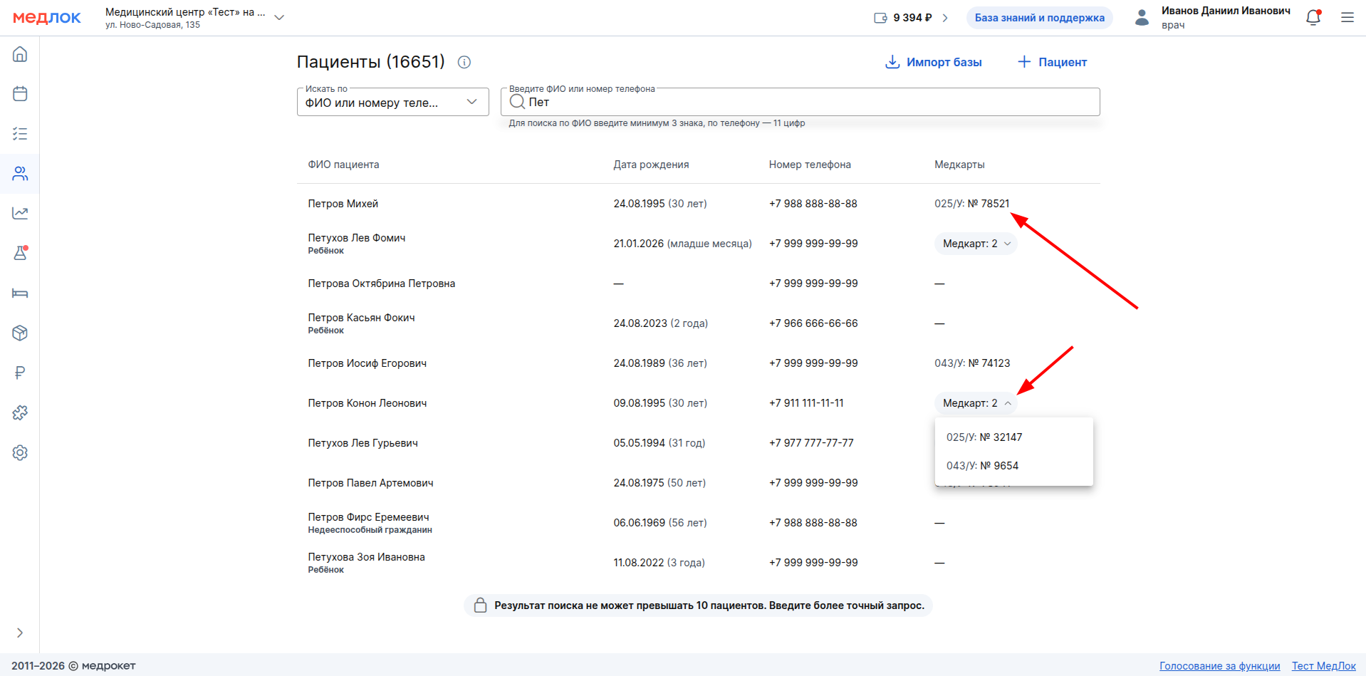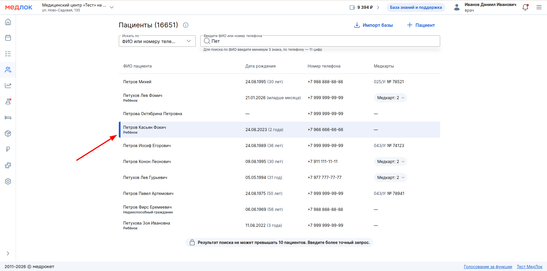 Результаты поиска не могут превышать 10 пациентов. Поэтому, если вы не видите нужного пациента, то нужно ввести более точный запрос. Об этом напомнит подсказка внизу списка.
