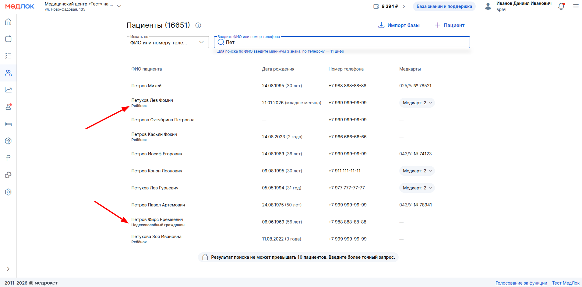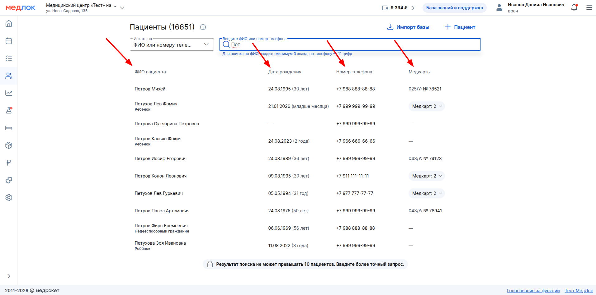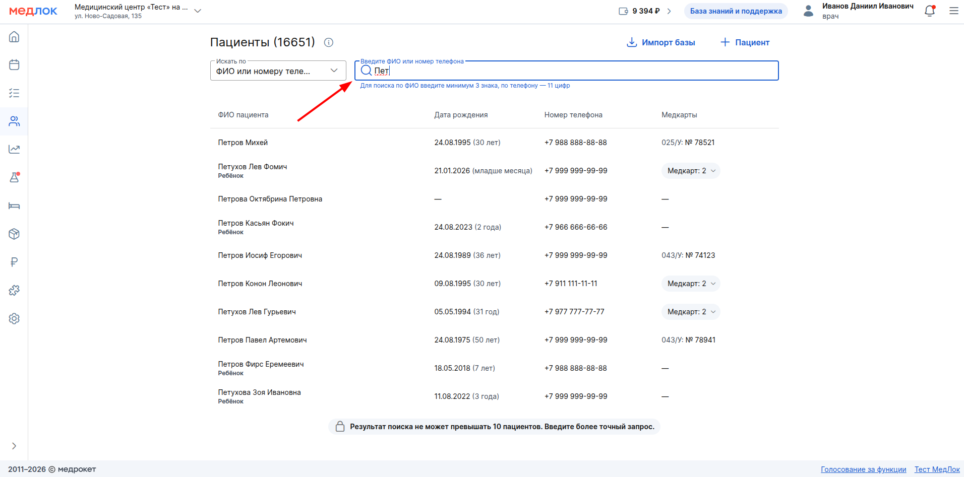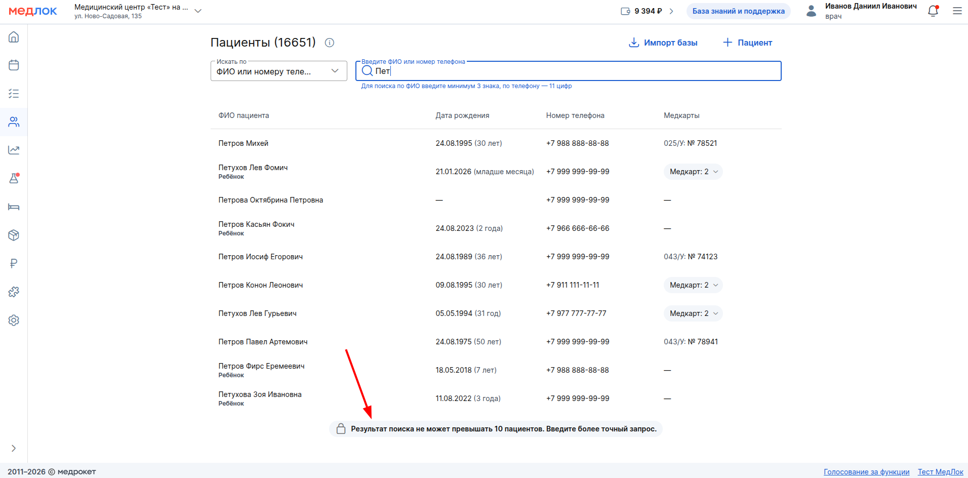 Результаты поиска не могут превышать 10 пациентов. Поэтому, если вы не видите нужного пациента, то нужно ввести более точный запрос. Об этом напомнит подсказка внизу списка.