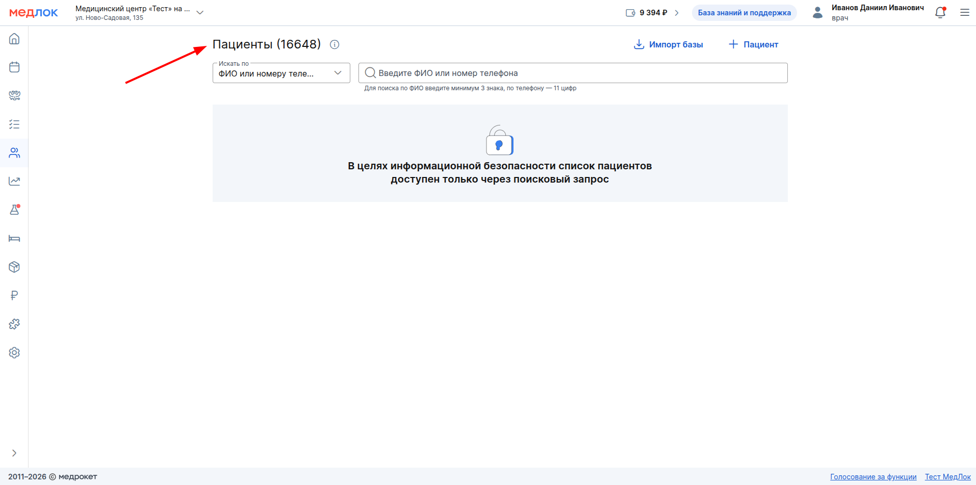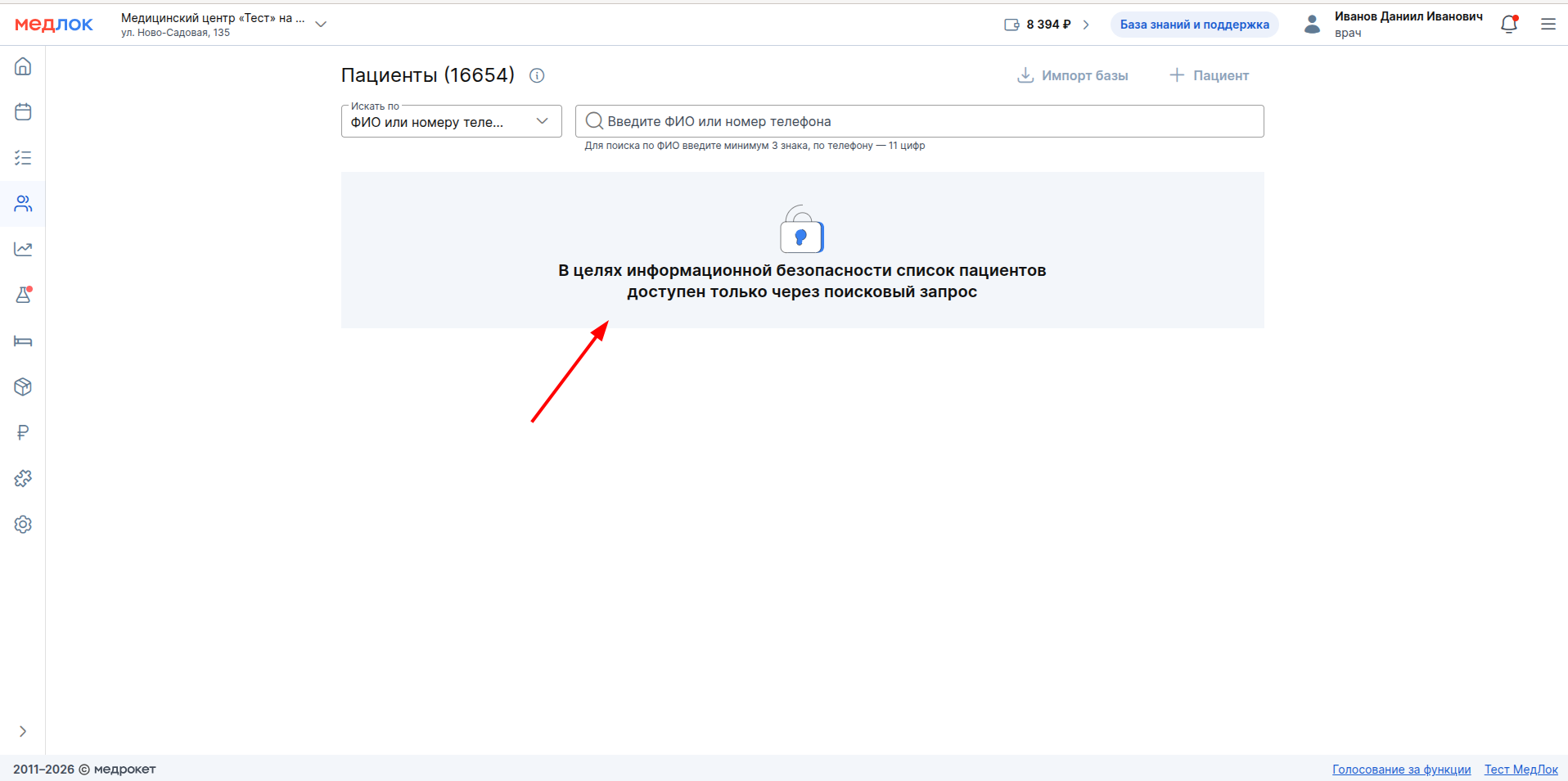 При переходе на эту страницу всегда появляется сообщение, что в целях информационной безопасности список пациентов доступен только через поисковый запрос.