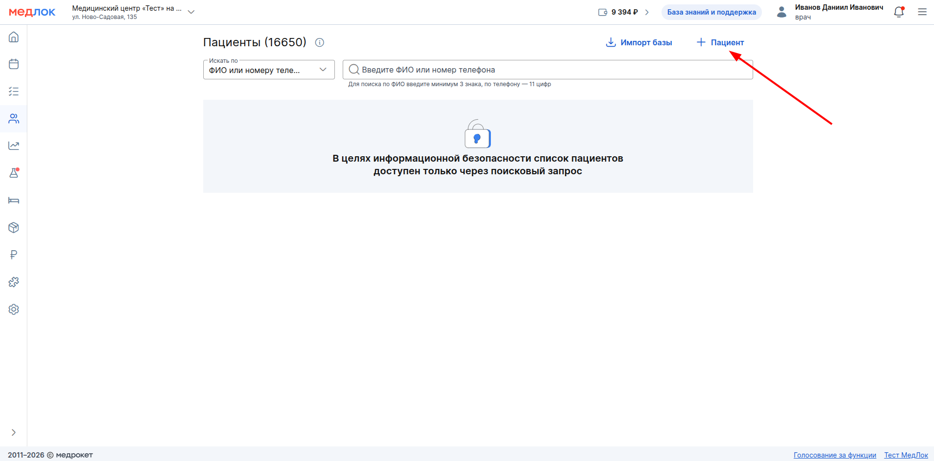 В разделе «Пациенты» хранится база пациентов, которые были добавлены в МедЛок.