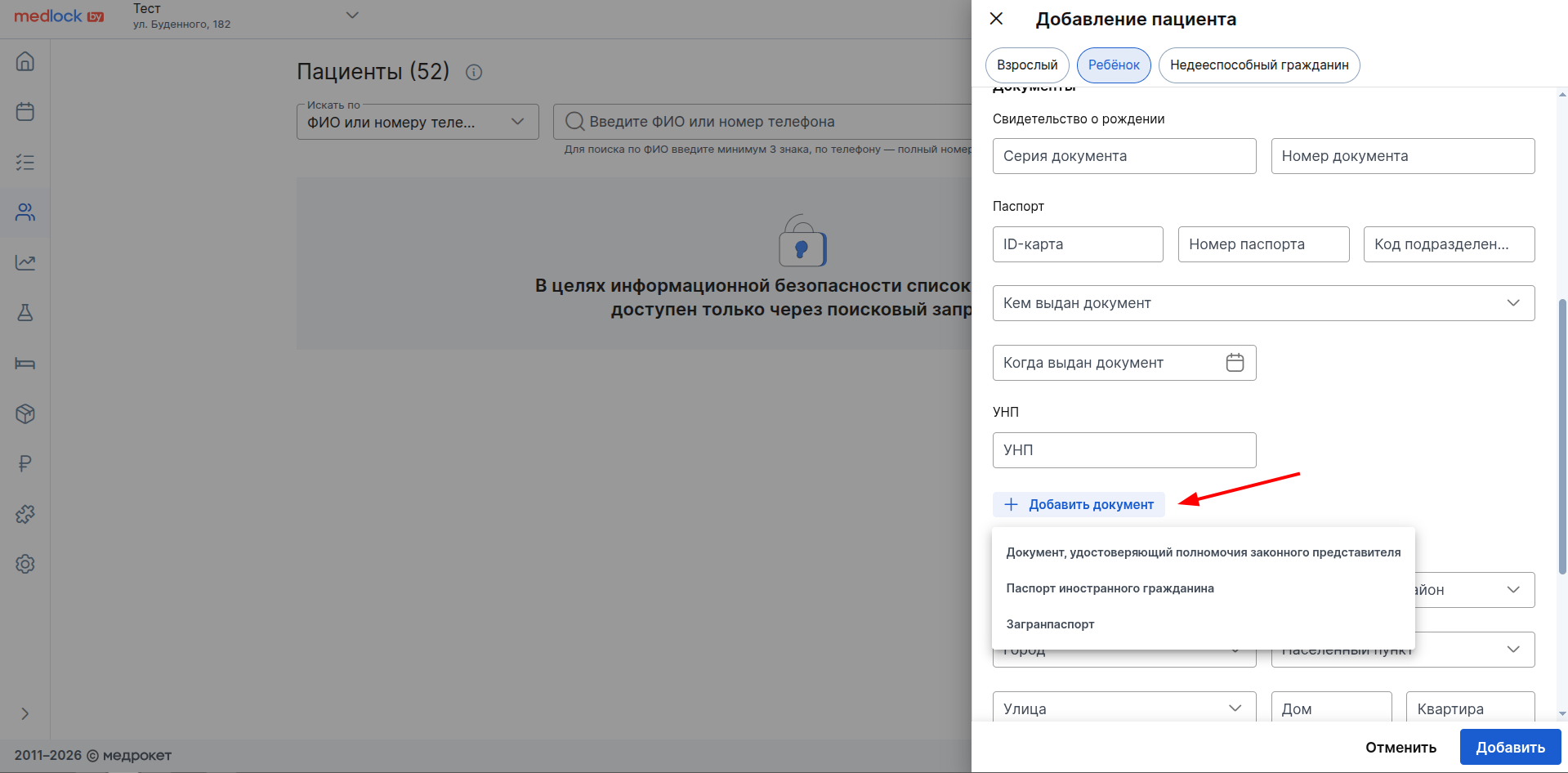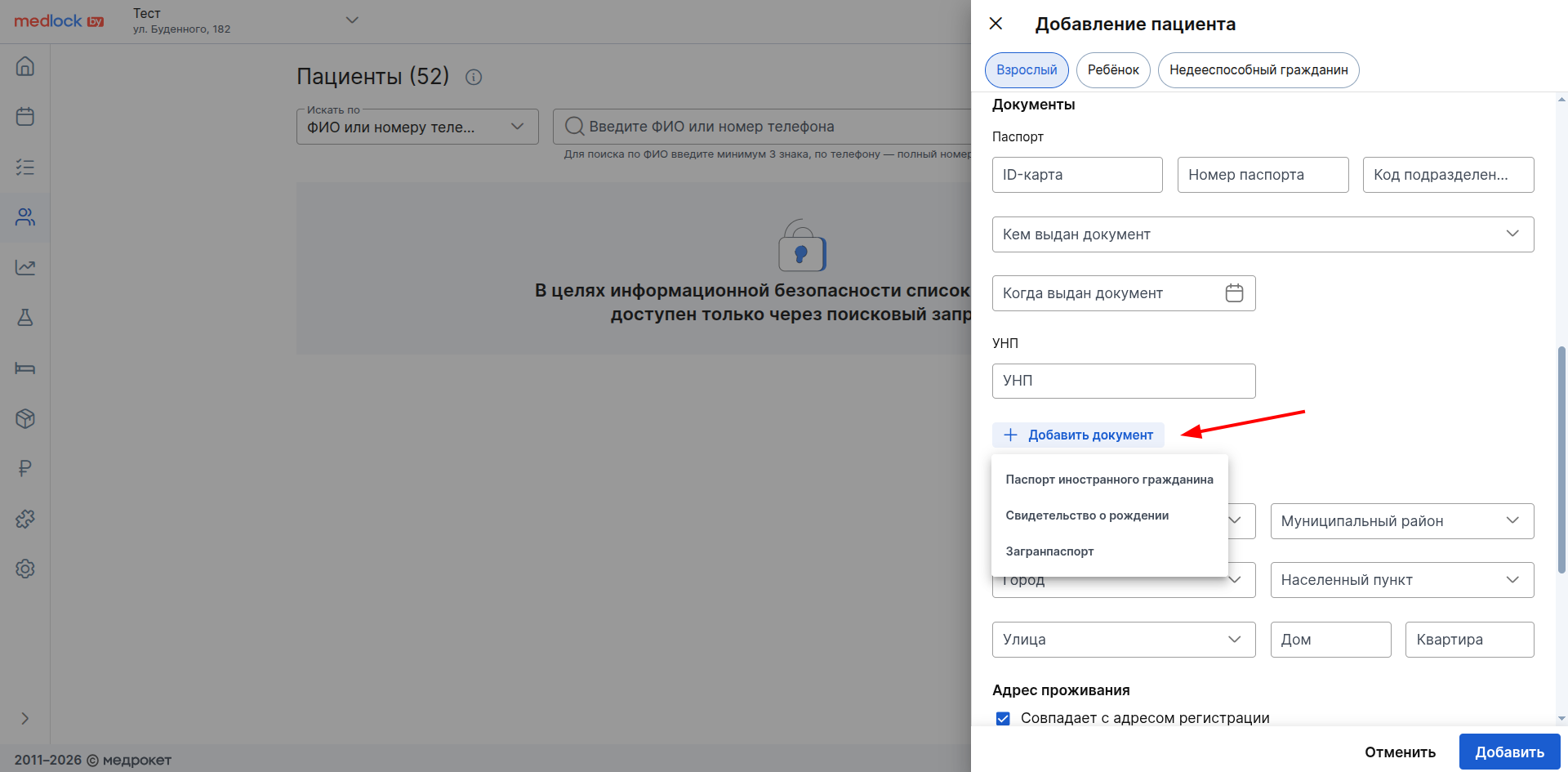 При добавлении взрослого пациента и недееспособного гражданина нажмите на кнопку «+ Добавить документ», чтобы указать данные паспорта иностранного гражданина, свидетельства о рождении и загранпаспорта пациента.