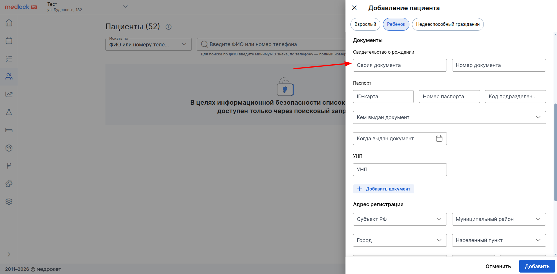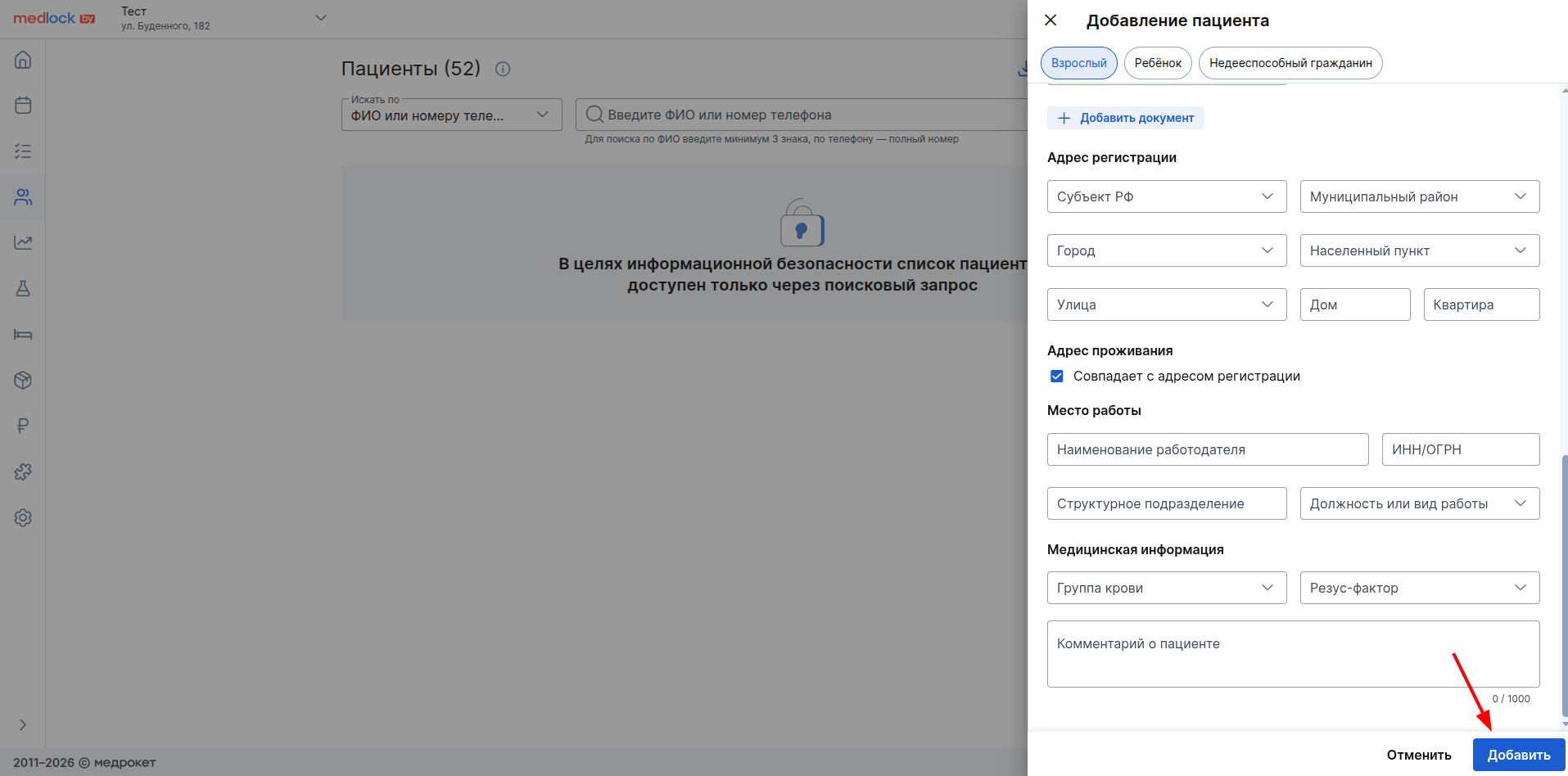 После указания всей необходимой информации о пациенте нажмите «Добавить» для сохранения введённых данных.