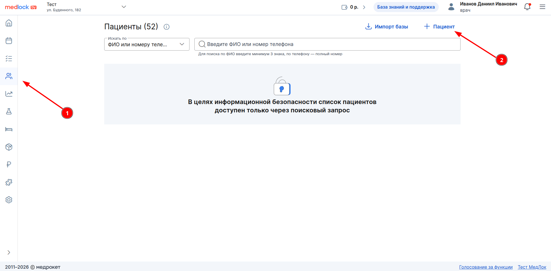 Важно! Для клиник в Казахстане также доступен поиск пациентов по индивидуальному идентификационному номера. Подробнее читайте в статье Работа с ИИН в МедЛоке для клиник в Казахстане.