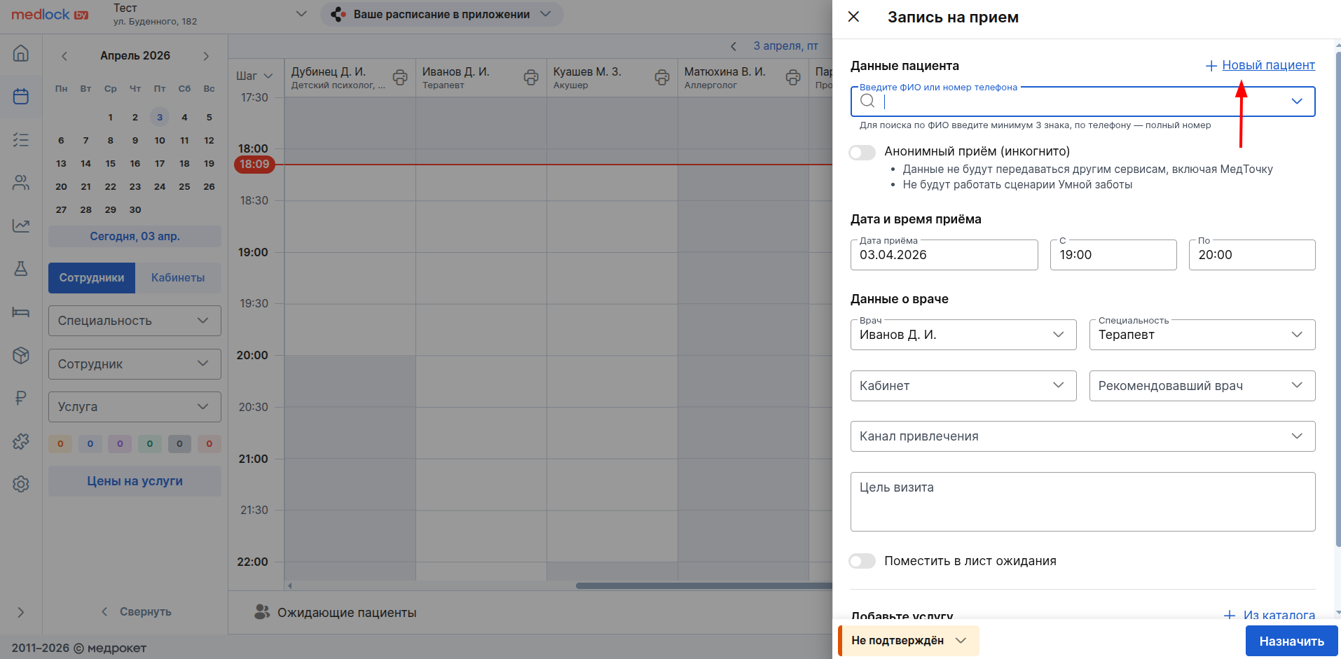 Чтобы добавить нового пациента, перейдите в соответствующий раздел и нажмите «+ Пациент».