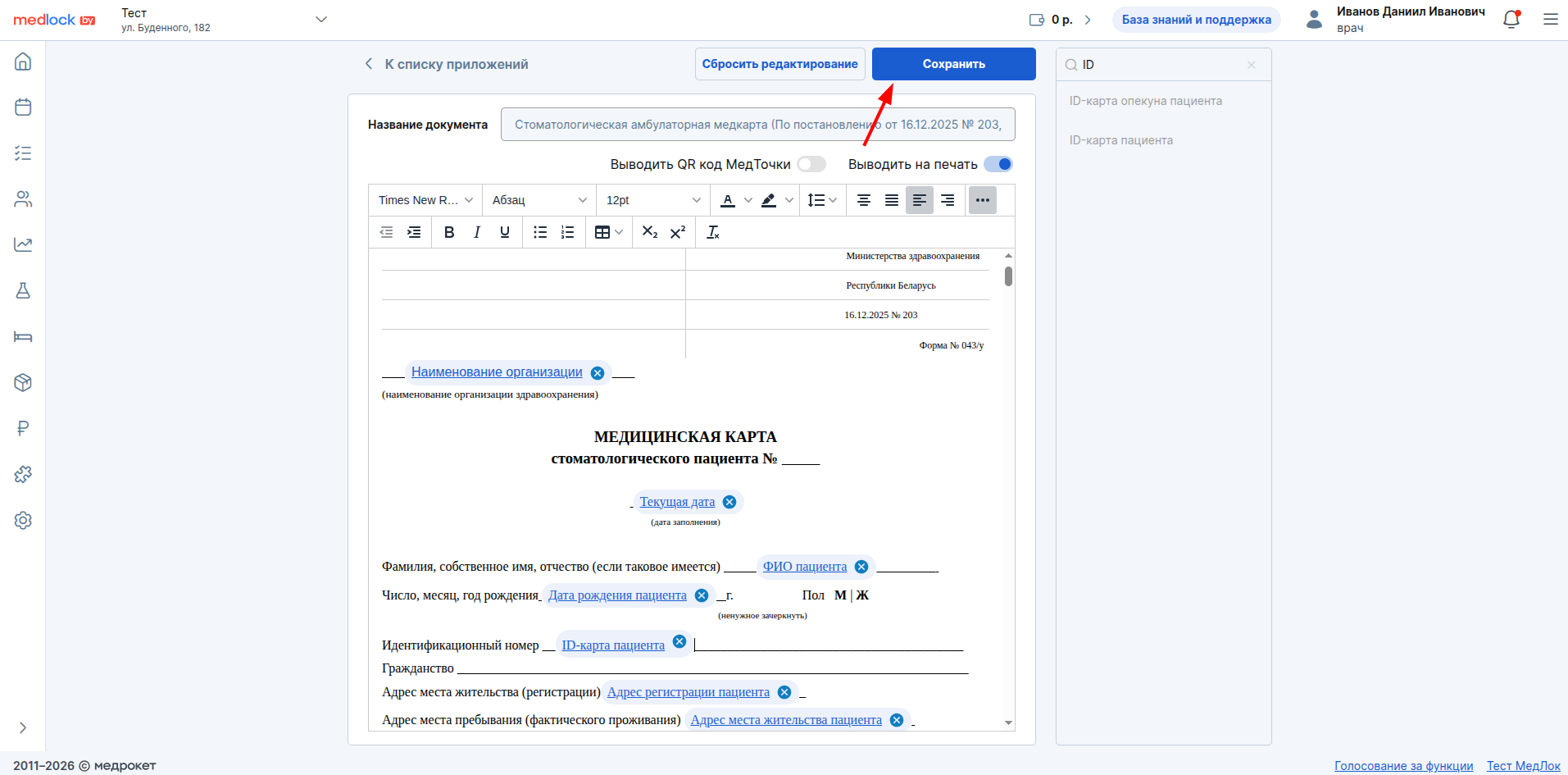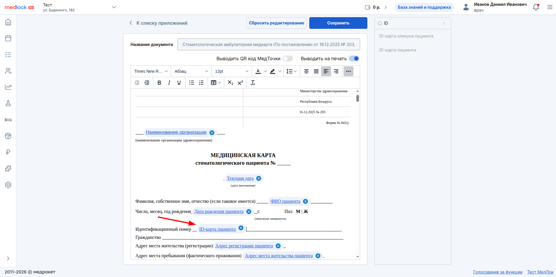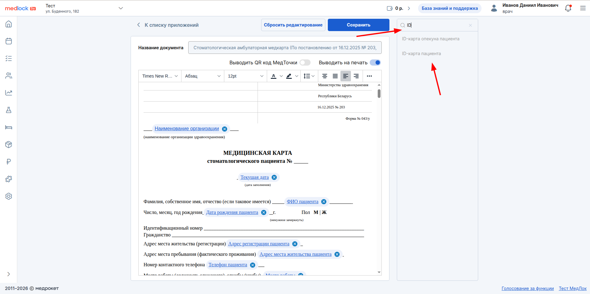 При создании шаблонов документов вы можете добавить переменные, чтобы данные пациентов автоматически подставлялись в них при печати из записи на приём.