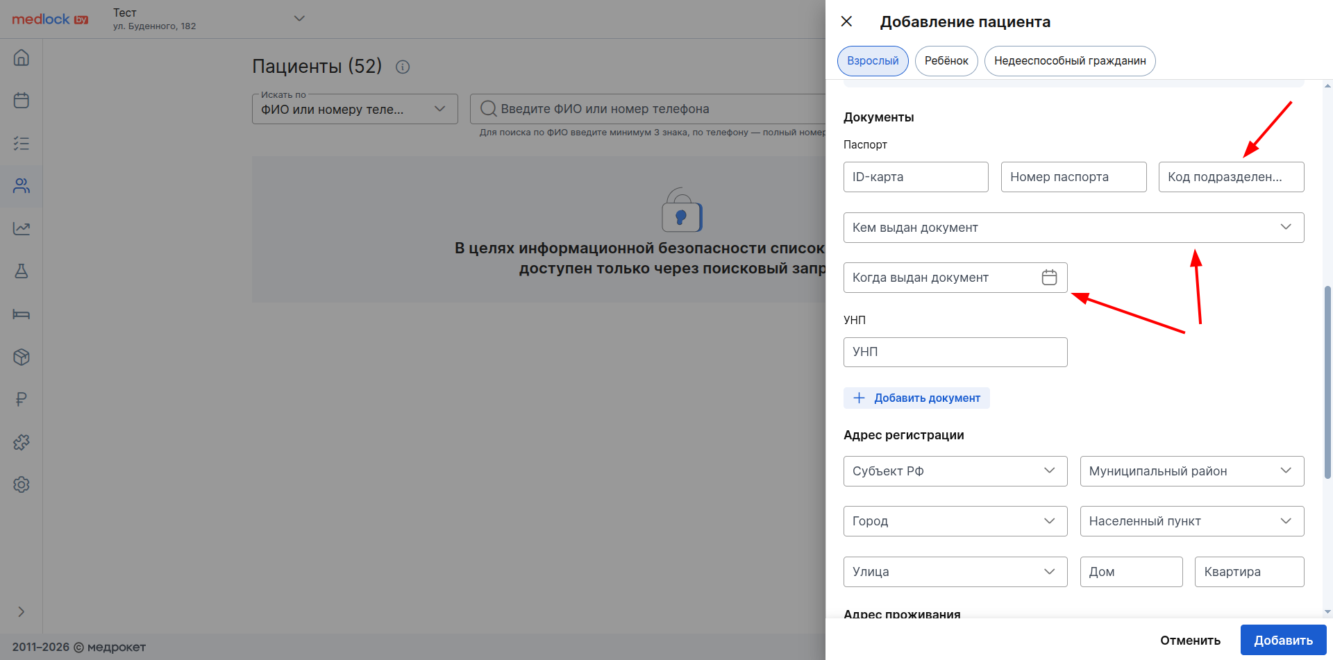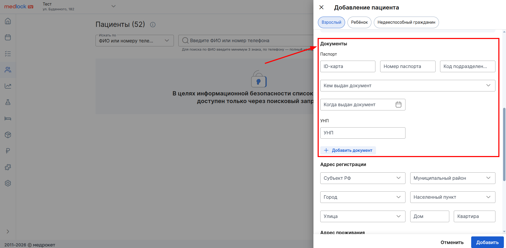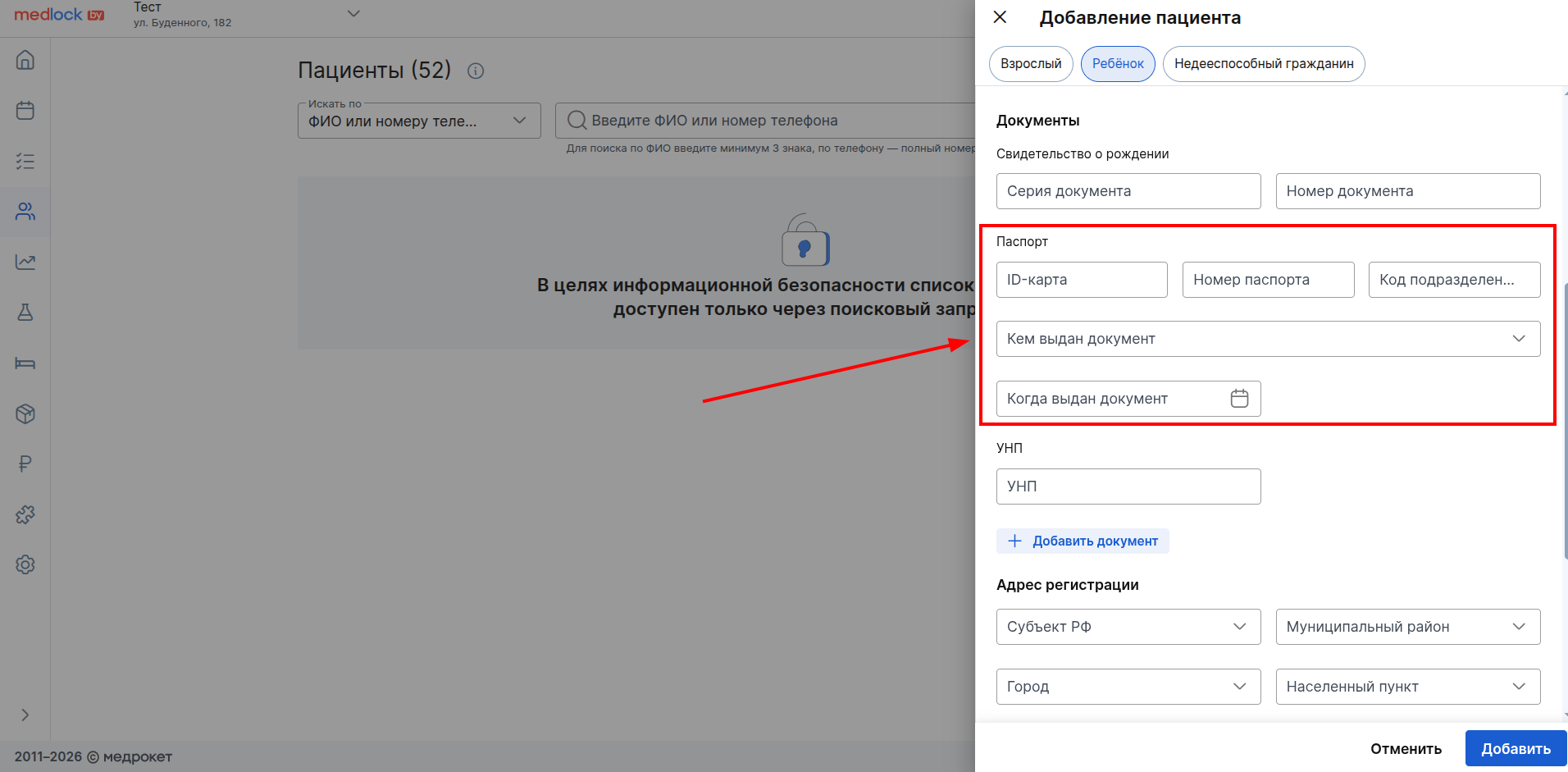 Важно! Если ранее в вашей клинике при добавлении пациентов использовалось поле, которое сейчас недоступно (например, «СНИЛС» или «Серия паспорта»), то данные из него перенесены в раздел «Комментарии о пациенте».