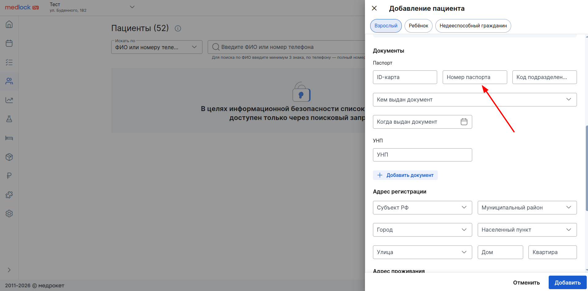 - Номер паспорта. Доступно для клиник в Республике Беларусь и Таджикистане: