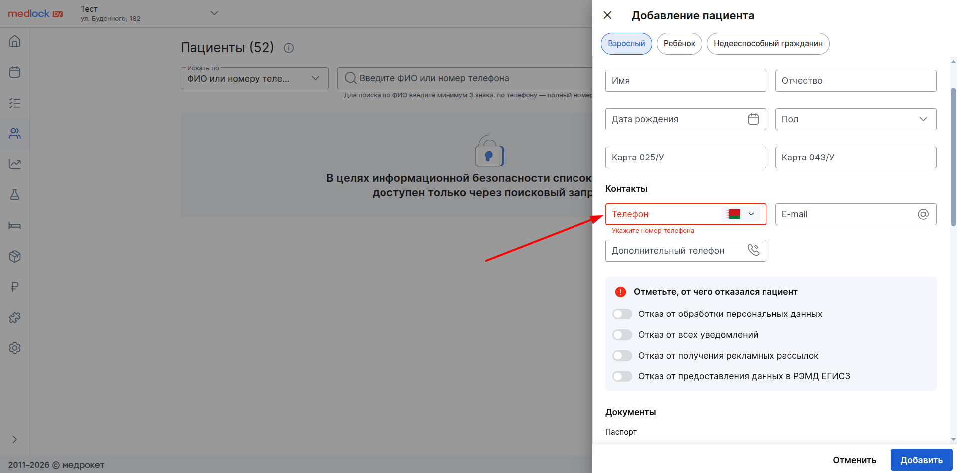 Для взрослого пациента обязательно укажите номер телефона пациента.