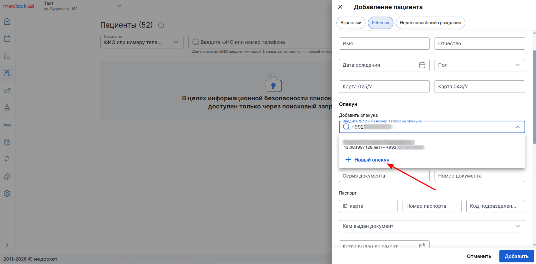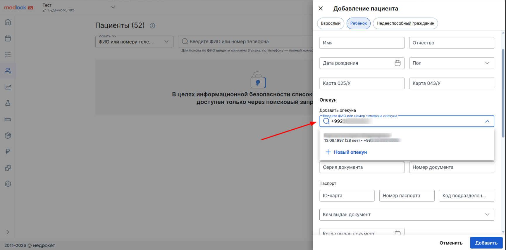 Для несовершеннолетнего и недееспособного пациента обязательно укажите опекуна из числа взрослых пациентов клиники или добавьте нового.