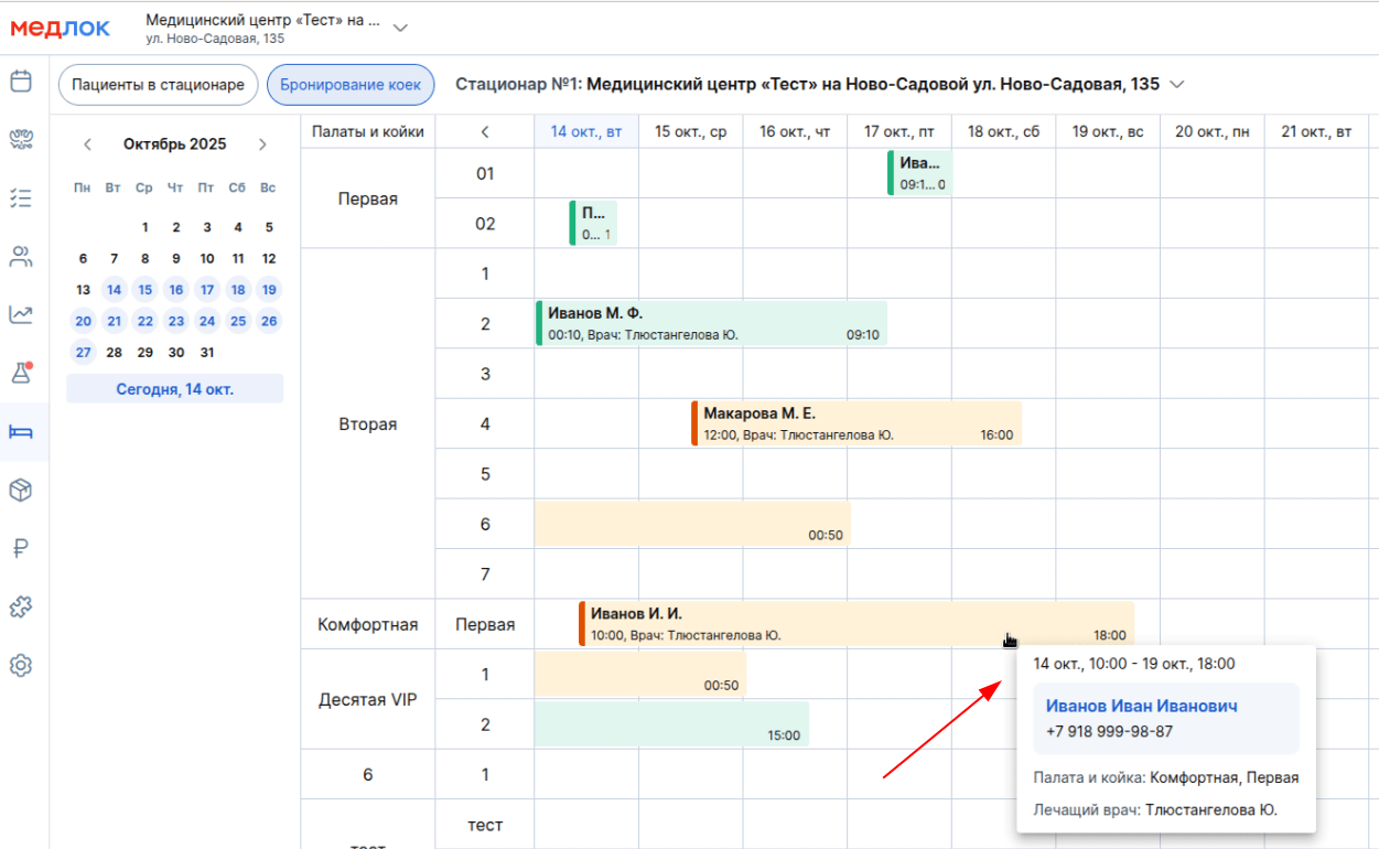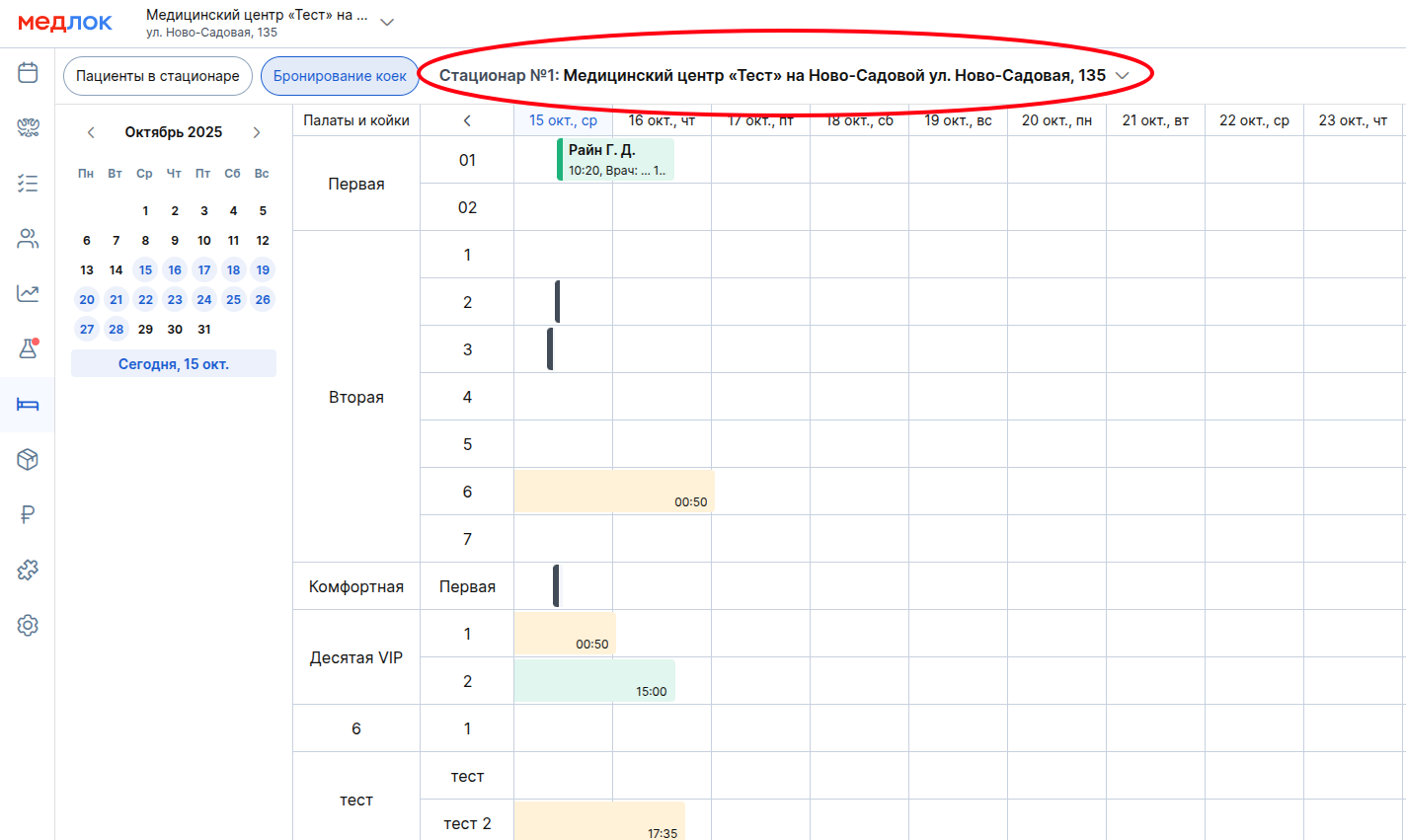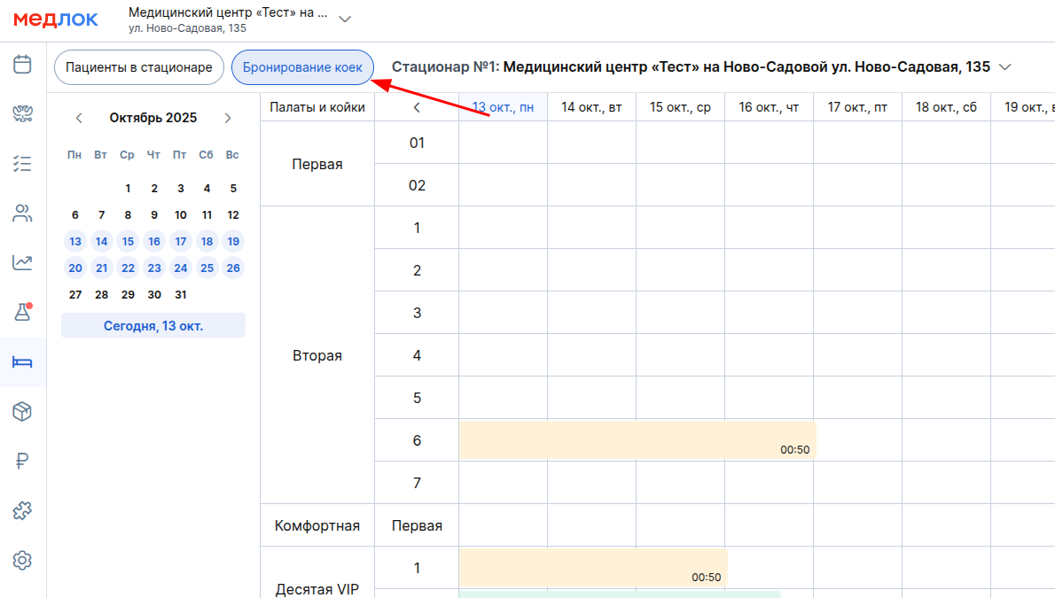 Чтобы записать пациента на госпитализацию, перейдите в расписание для бронирования коек, для этого нажмите на раздел «Стационар» в боковом меню.