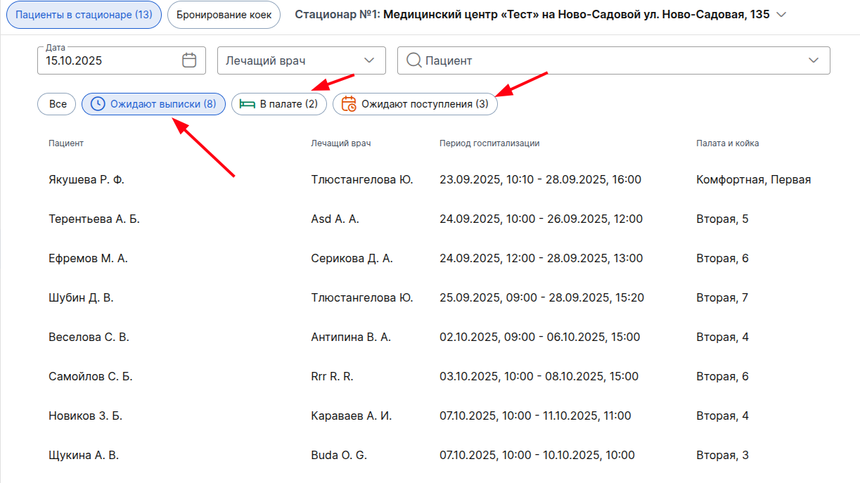 - «Ожидают поступления» — пациенты, у которых запланировано поступление в выбранную дату.
