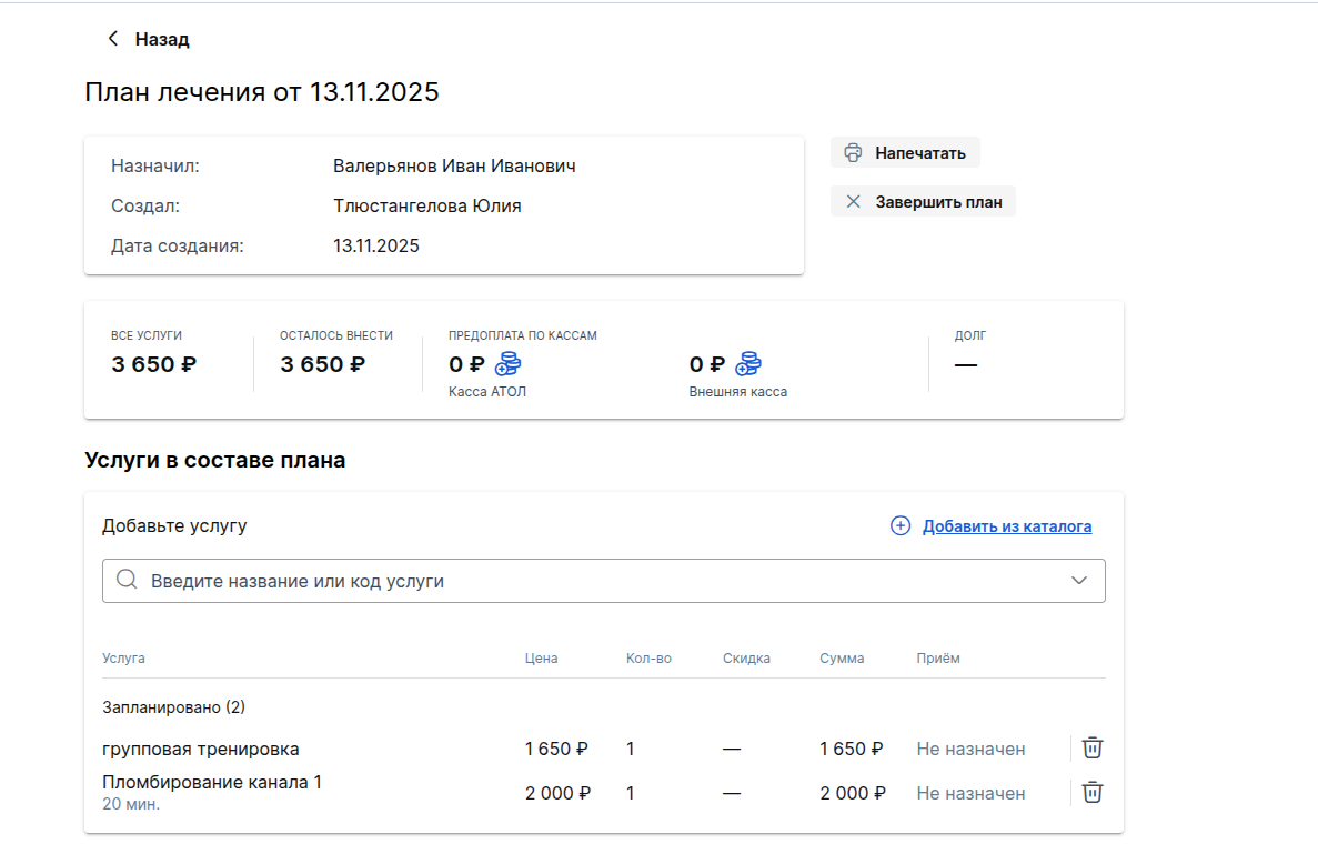 - Если пациенту был назначен план лечения, можно выбрать услуги из него, нажав на