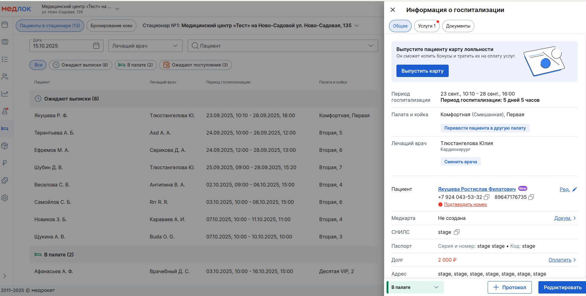 - Момент перевода в статус «В палате» автоматически фиксируется как время начала госпитализации.