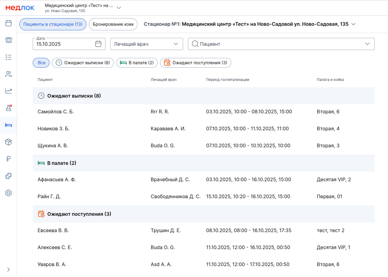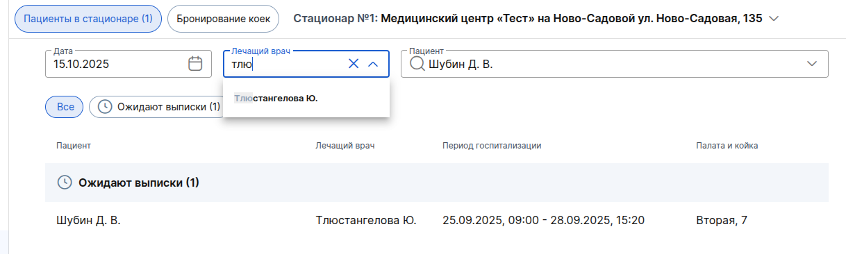 - «Ожидают выписки» — пациенты, у которых на выбранную дату запланирована выписка.