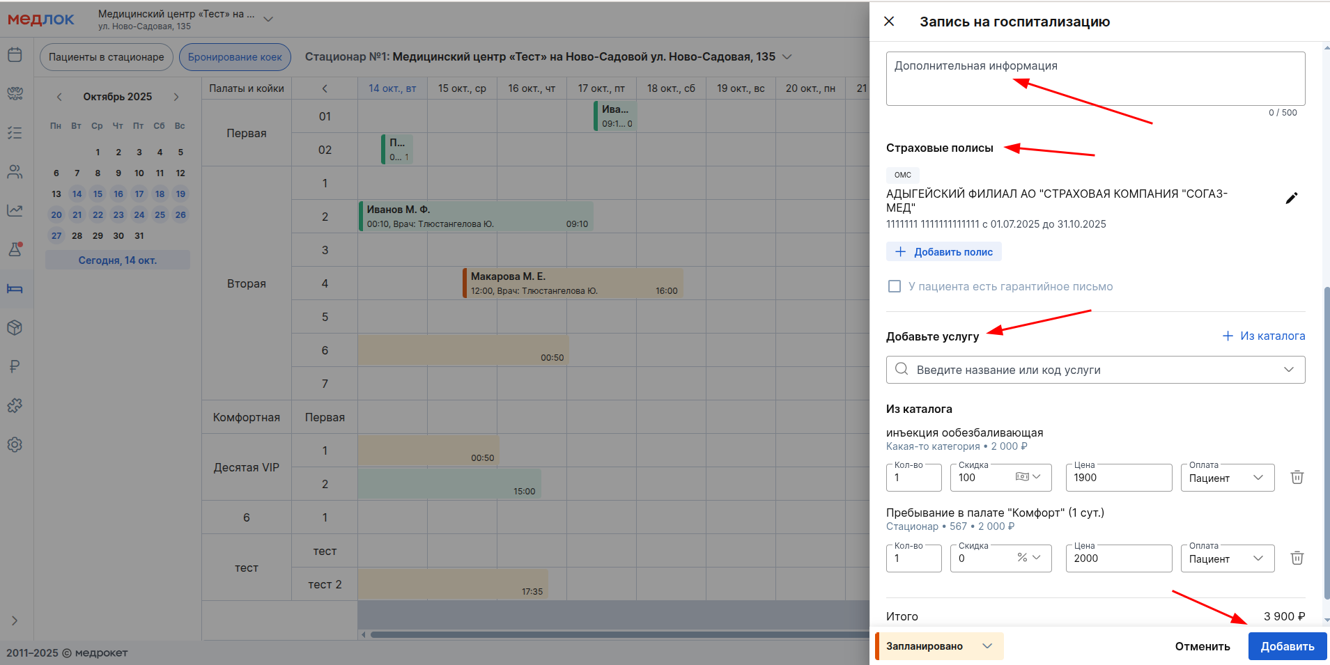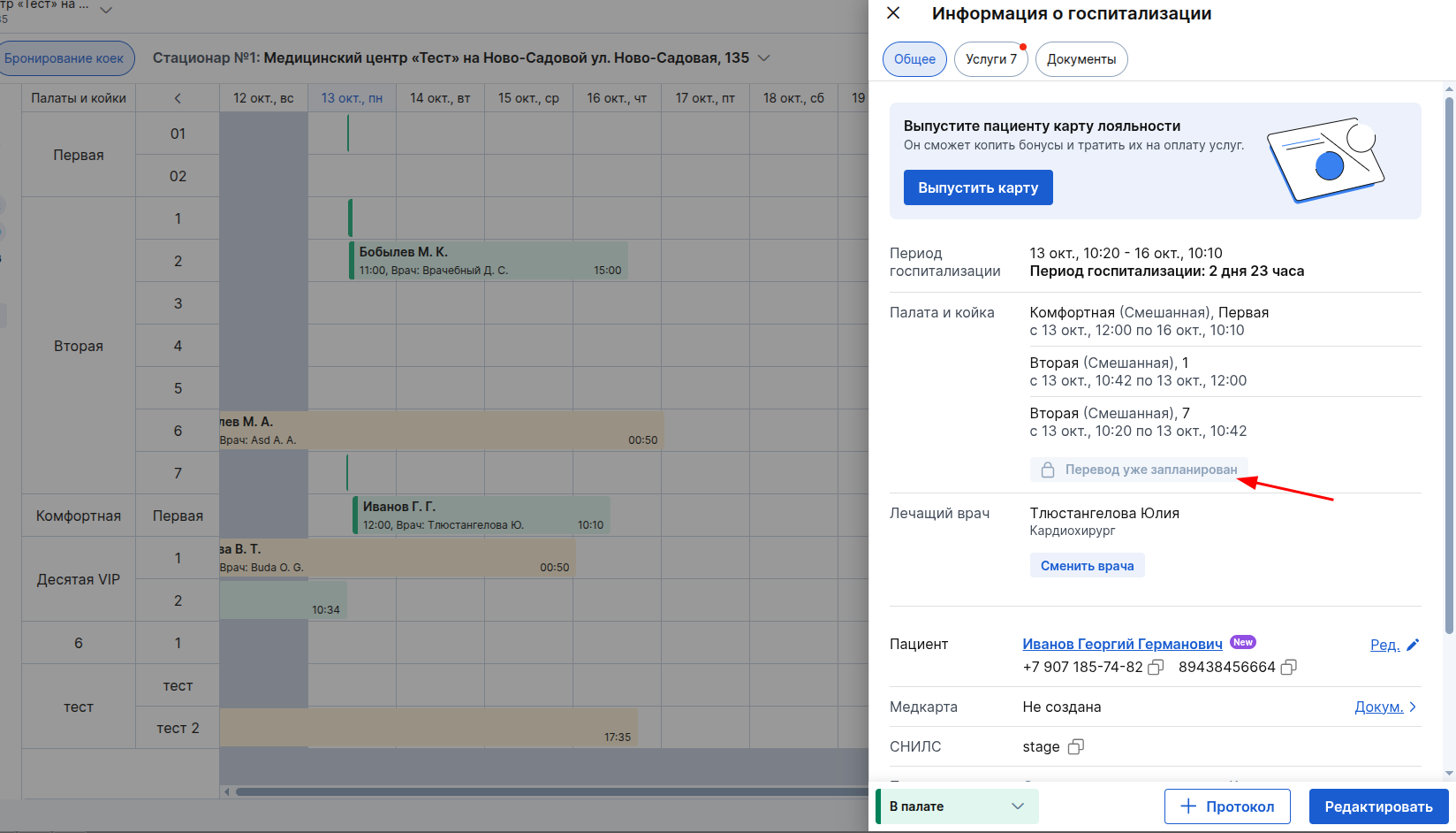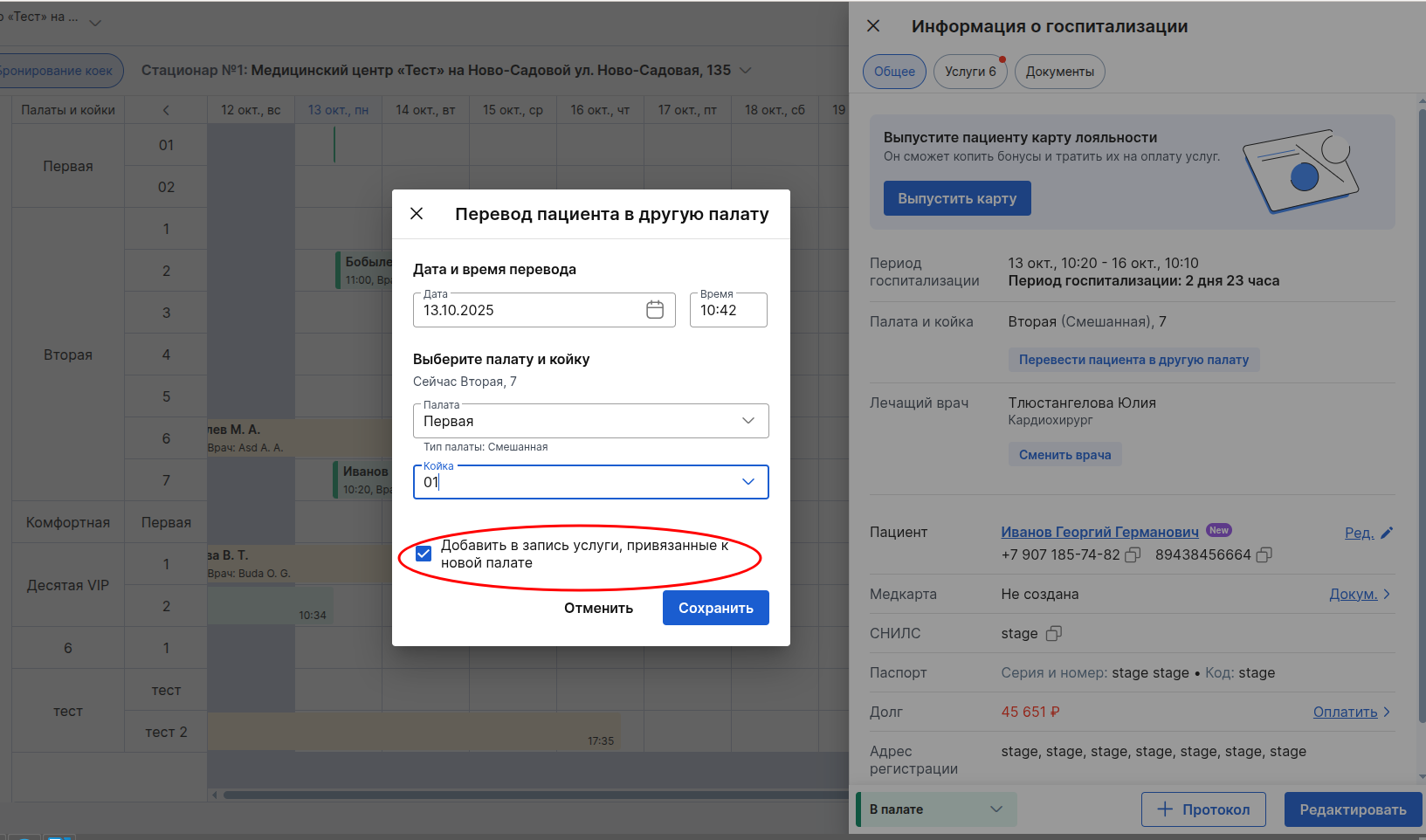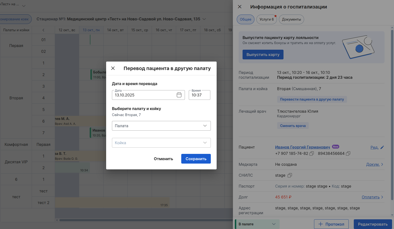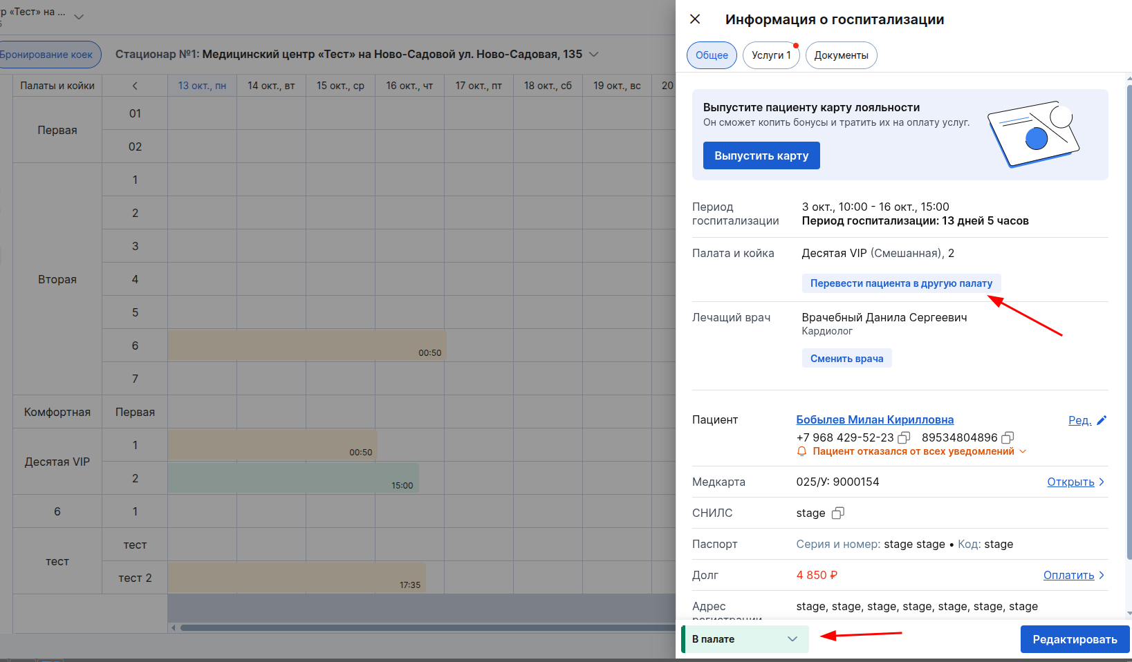 - Проверьте корректность выставленной палаты и койки - они проставляются автоматически из выбранной ранее ячейки.