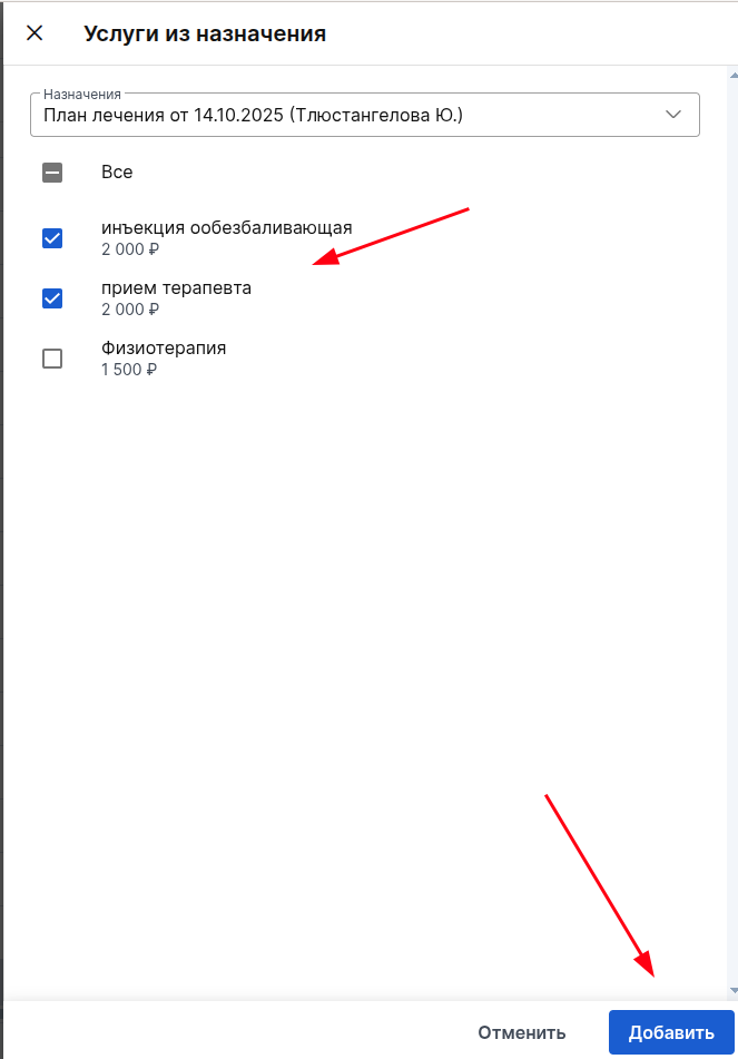 - Выберите необходимые услуги из списка по плану лечения и нажмите кнопку «Добавить»: