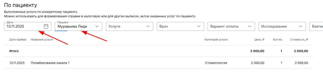 - Пациент: найдите пациента в системе или создайте нового, нажав в правом верхнем углу «+ Новый пациент».
