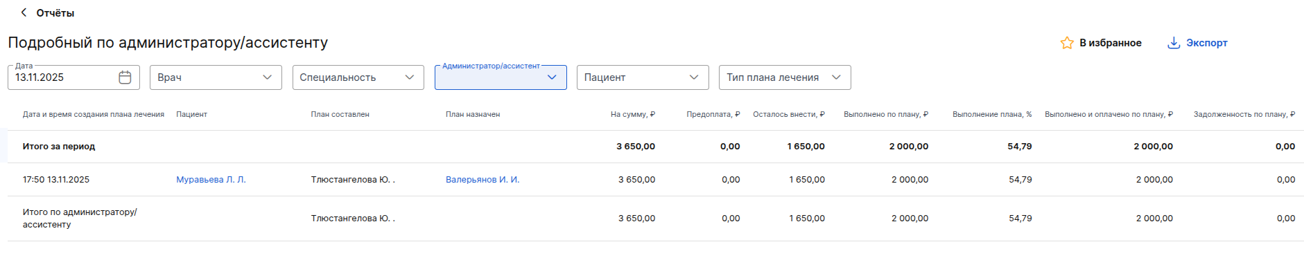 будут сформированы подробные данные по плану лечения и выполненным услугам в стационарной записи созданной администратором/ассистентом: