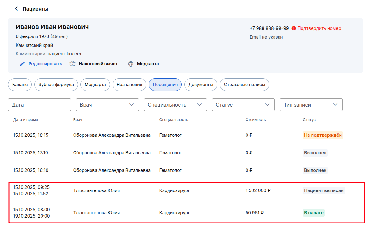 - Смена статуса: можно перевести в «Пациент выписан» или «Отмена».