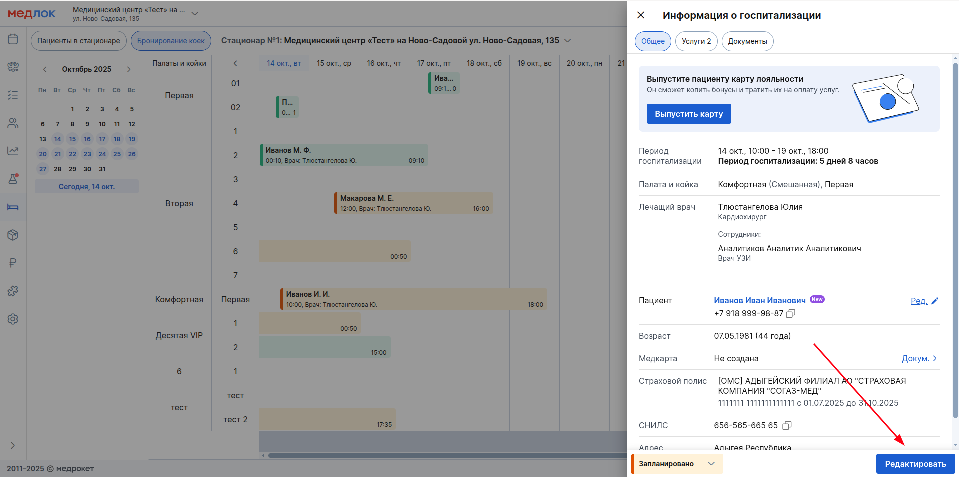 - ФИО и номер телефона пациента (с переходом в редактирование);