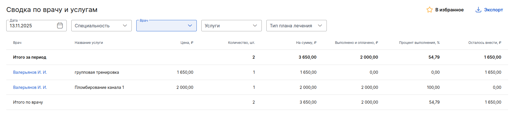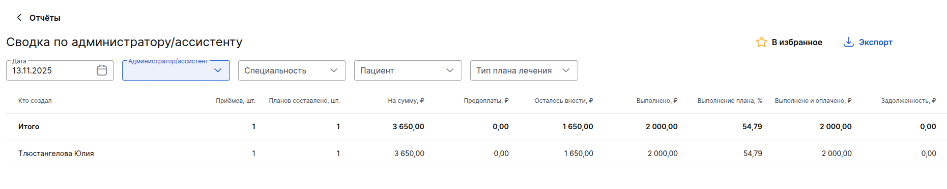 будут сформированы сводные данные по плану лечения и выполненным услугам в стационарной записи созданной администратором/ассистентом: