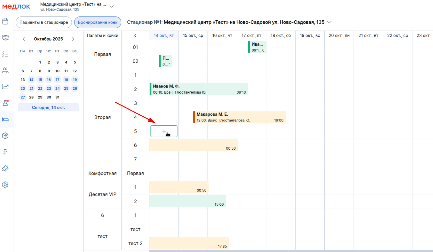 В расписании бронирования коек выберите нужную ячейку в соответствующей палате и нажмите на неё.