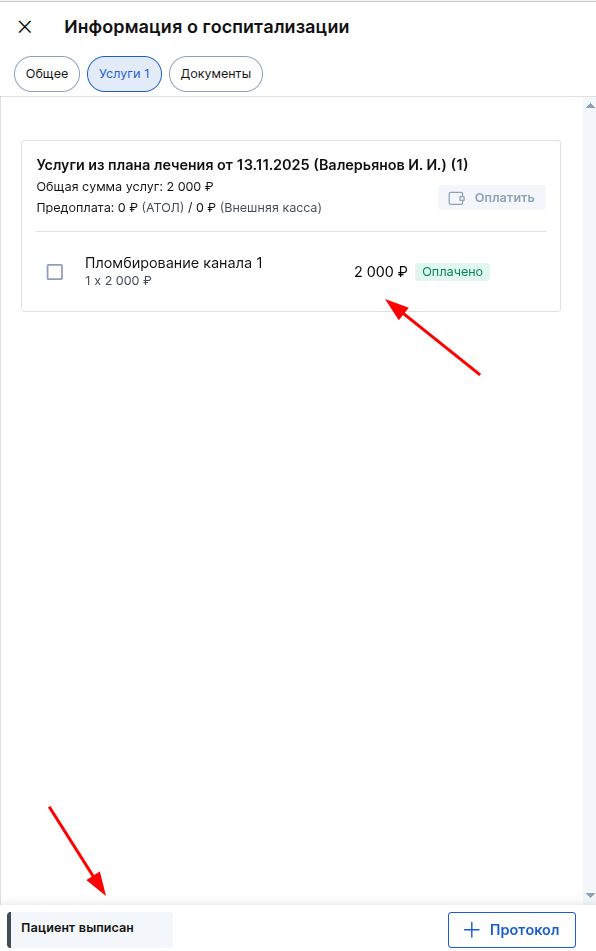 В запись госпитализации из этого плана была добавлена и оплачена услуга и запись госпитализации завершена: