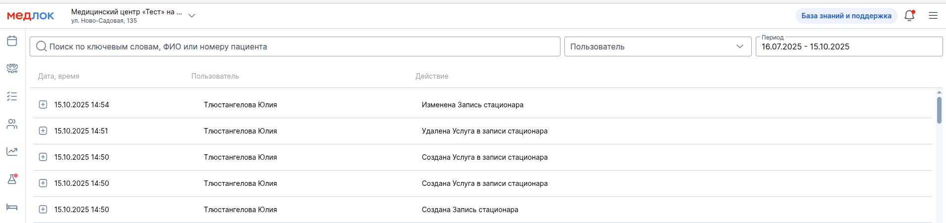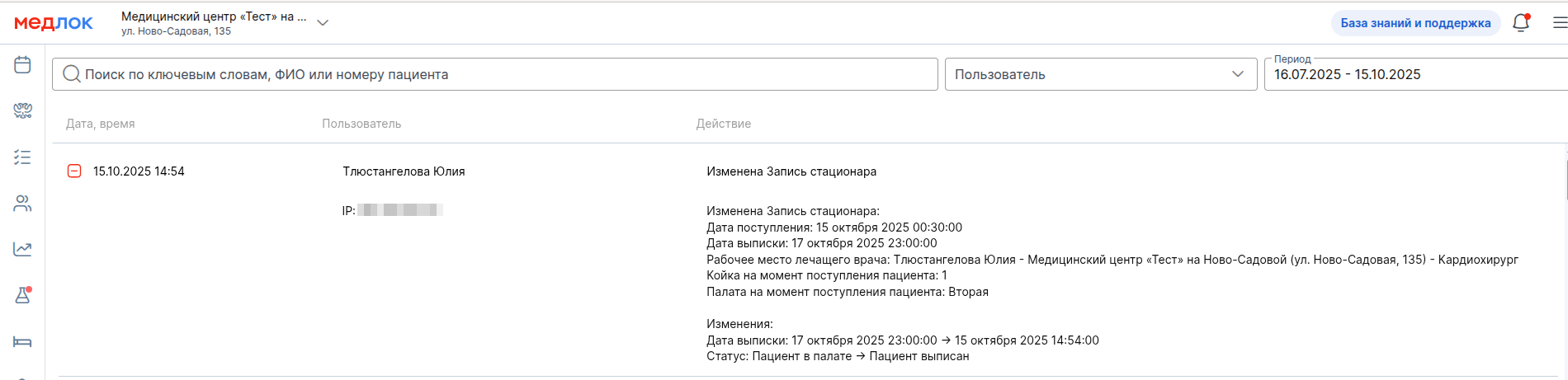 - Момент перевода в статус «Пациент выписан» автоматически фиксируется как время выписки.