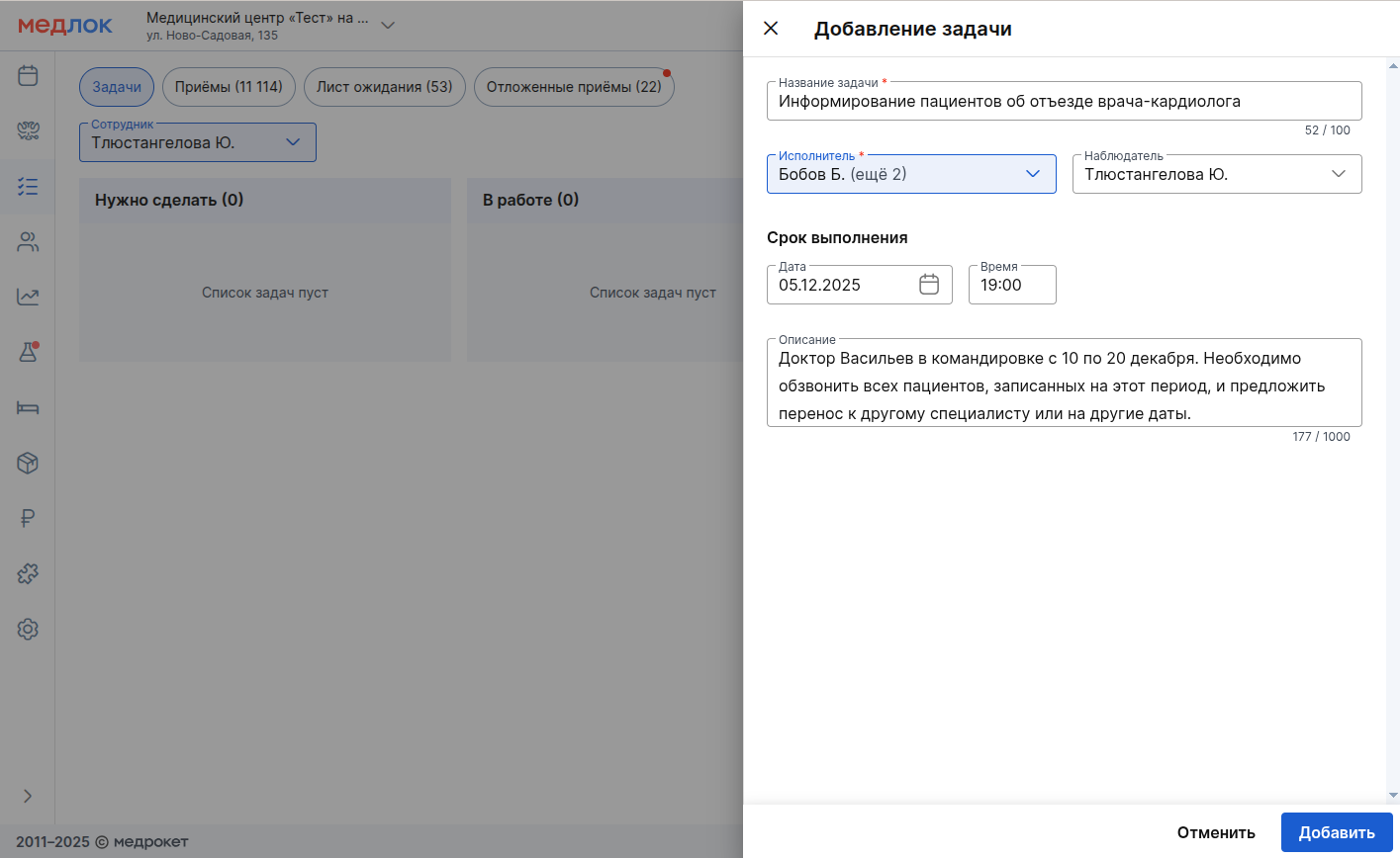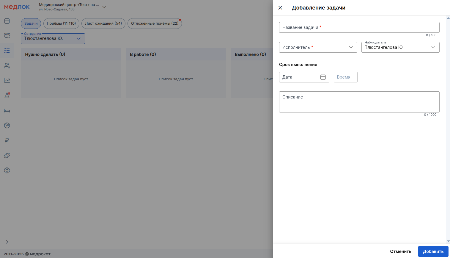 - Нажмите кнопку «+ Задача» (доступна при правах «Редактирование задач» и выше) и заполните информацию в открывшейся панели: