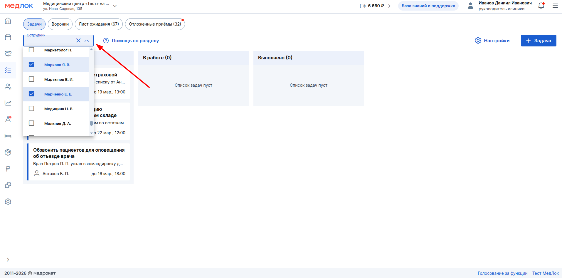 - В фильтре можно выбрать нескольких сотрудников.