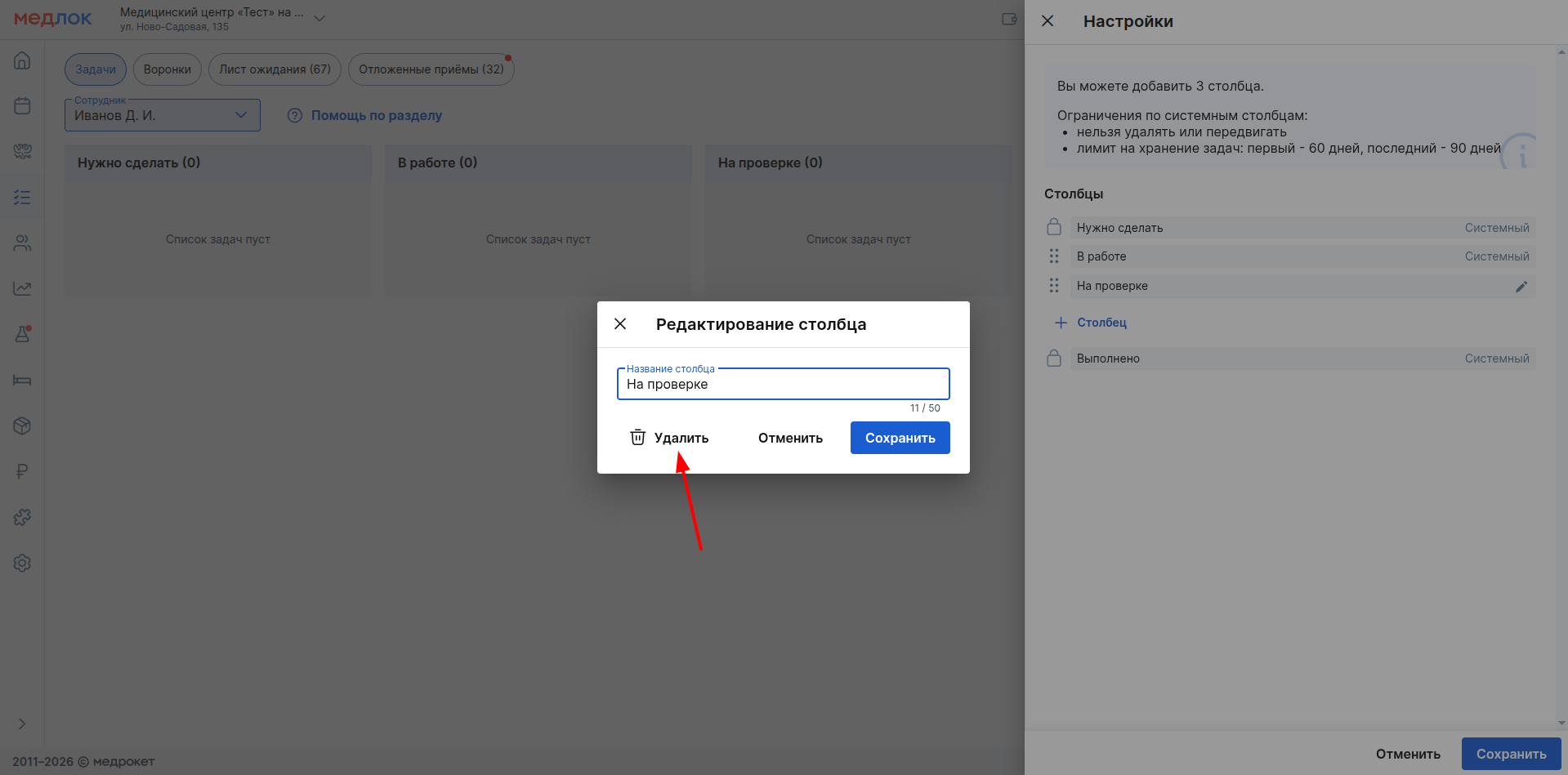 - При удалении столбца все задачи в нём будут безвозвратно удалены.
