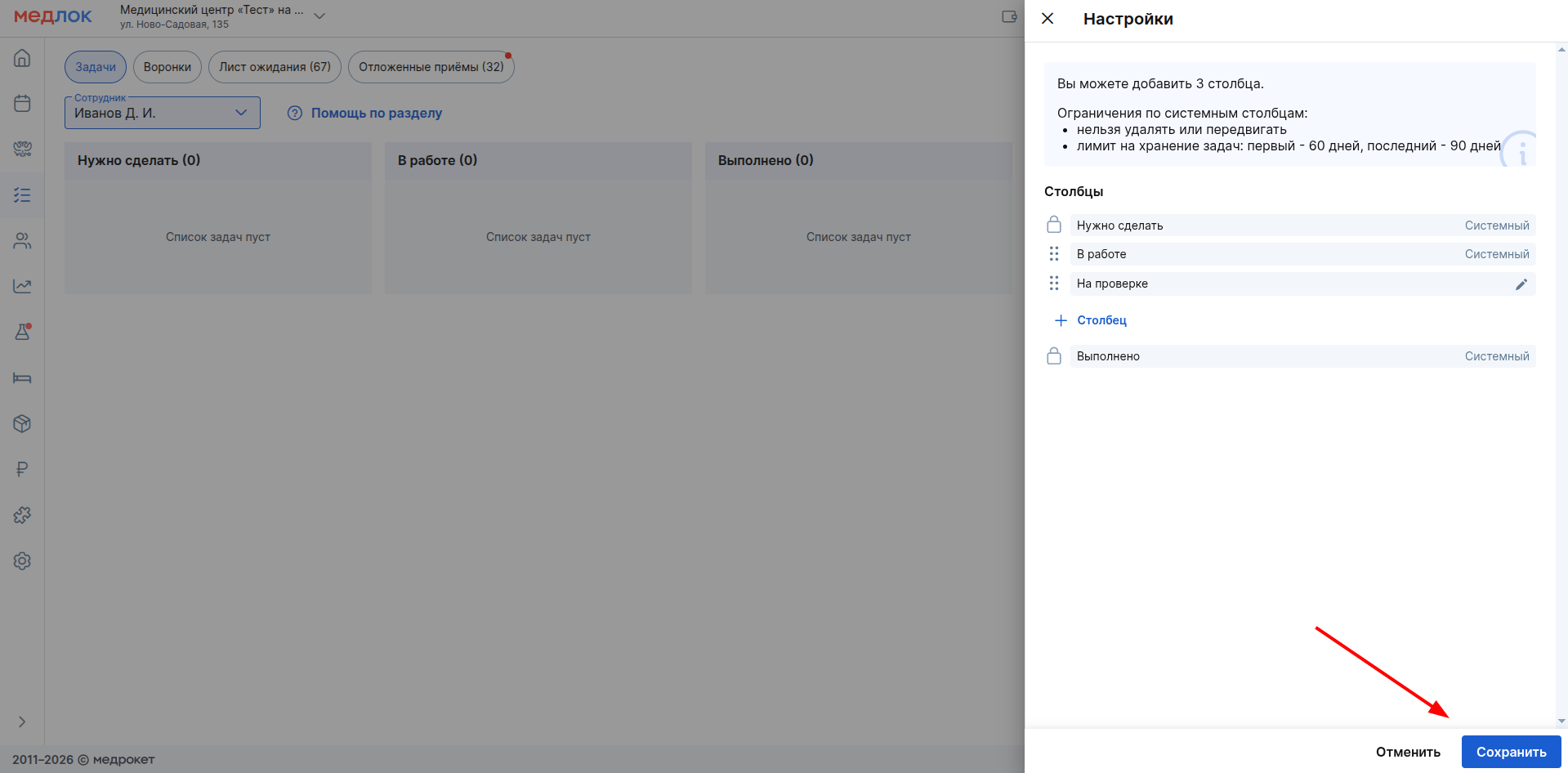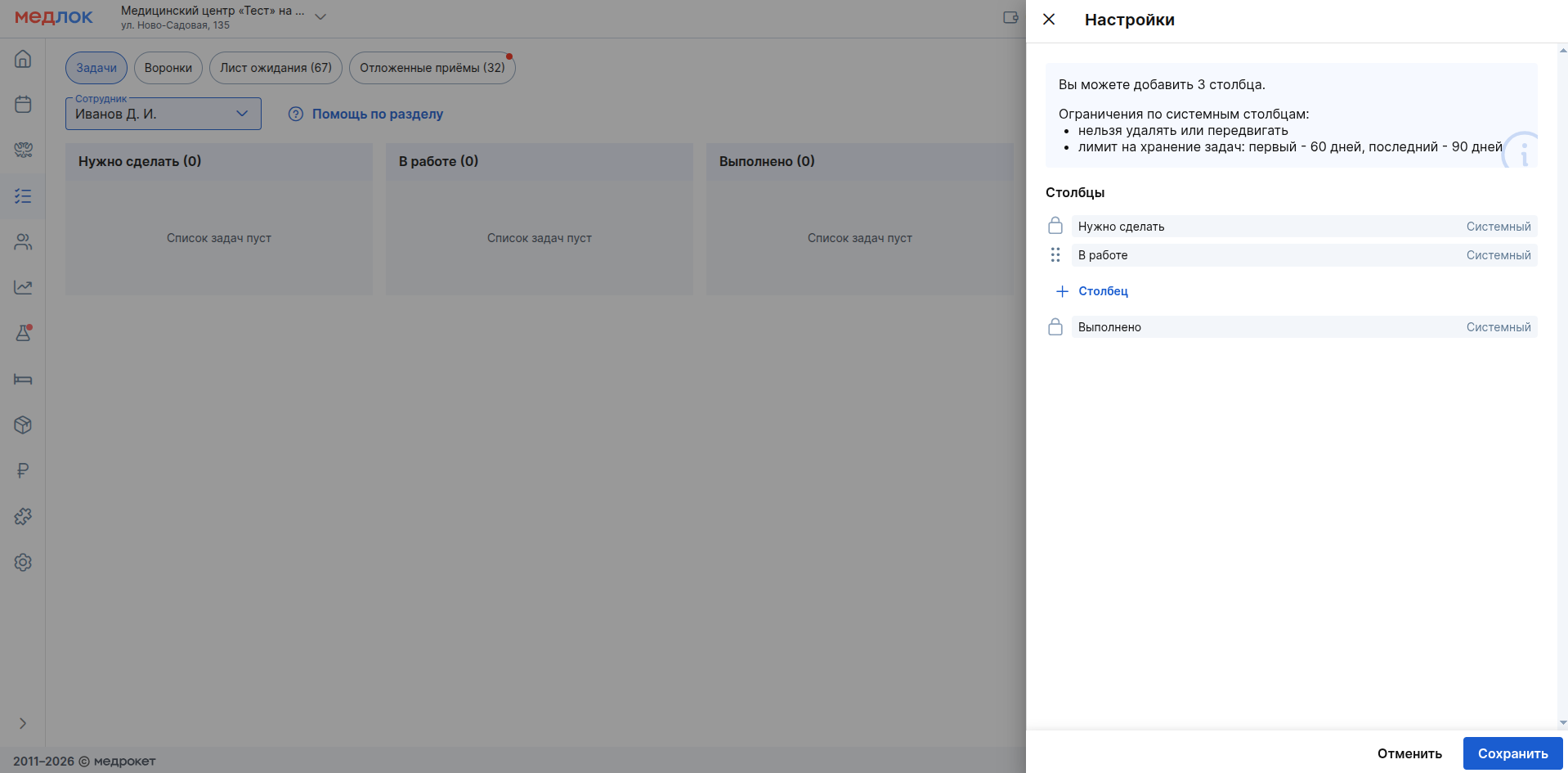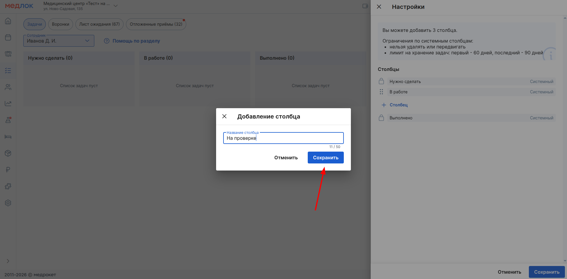- для добавления нового столбца нажмите «+ Столбец». В открывшемся окне введите название (обязательное поле, не более 50 символов) и нажмите «Сохранить».