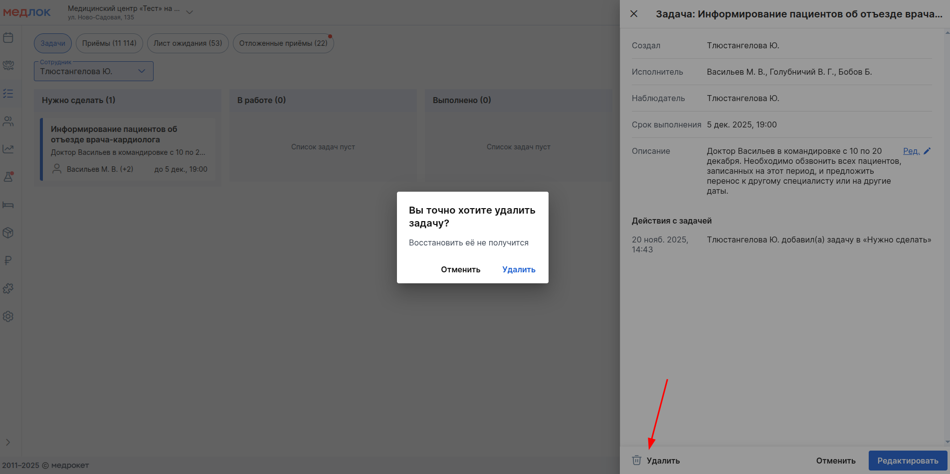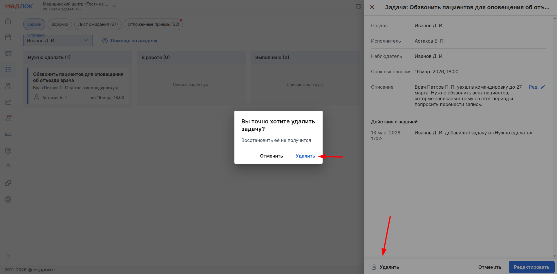 - «Удалить» - удаленные задачи не подлежат восстановлению режиме;